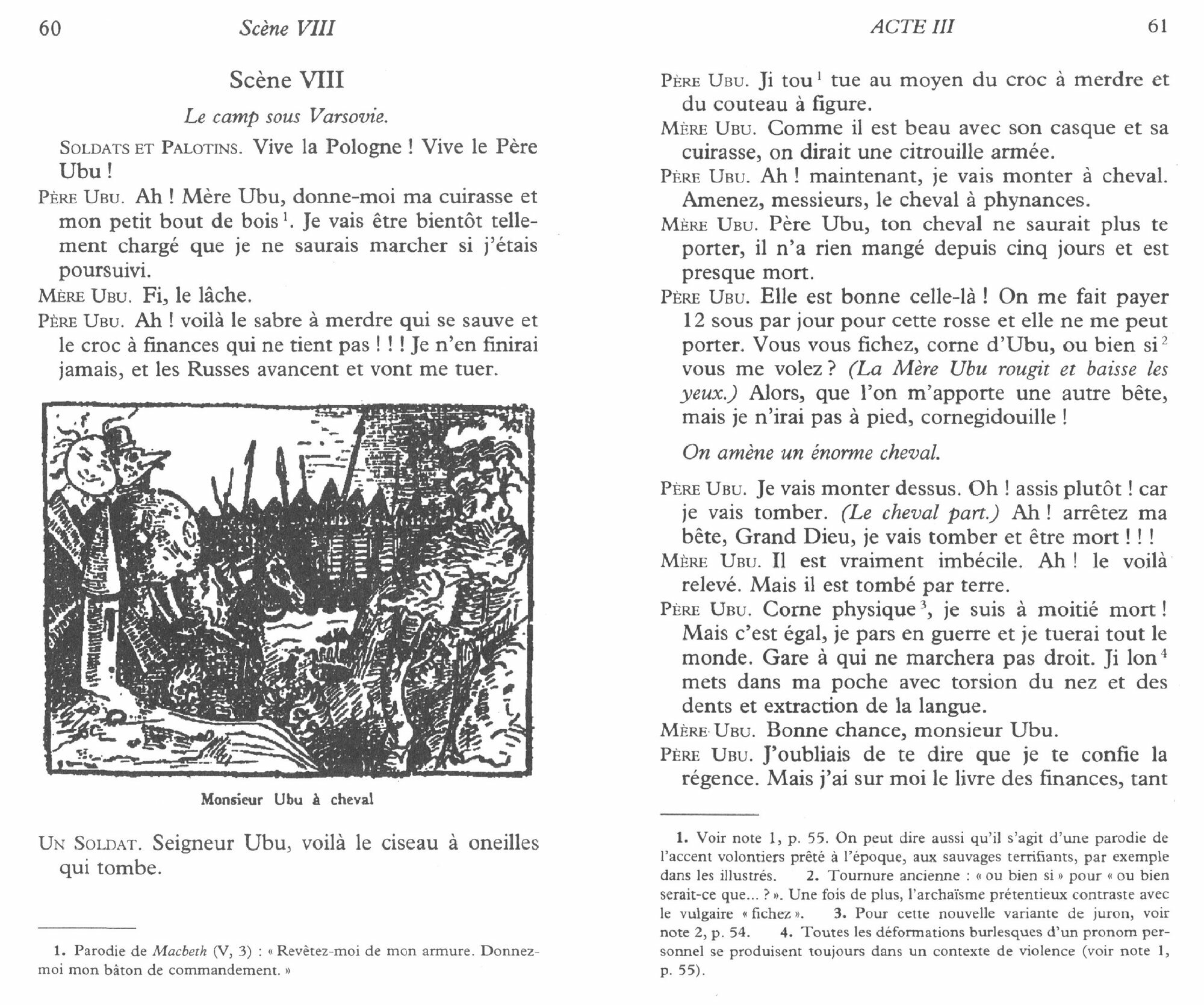 Officier du roi Venceslas, decore de l'ordre de l'Aigle rouge, Ubu jouit d'une position enviable a la cour de Pologne. Mais sa femme, la Mere Ubu, a bien d'autres ambitions pour lui. En le persuadant de detroner Venceslas, elle va le precipiter dans de multiples aventures. Ubu sera tour a tour roi, guerrier et fuyard, avant de devenir «maitre des Phynances» dans son pays d'origine, la France... En composant a quinze ans cette oeuvre parodique et bouffonne, qui fit scandale lors de sa creation en 1896, Alfred Jarry (1873-1907) ne se doutait certes pas qu'il allait marquer de son empreinte tout le theatre du xxe siecle, de Roger Vitrac a Boris Vian et a Eugene Ionesco. Il y a du Shakespeare et du Rabelais dans cette fantaisie «henaurme» et truculente, au rythme debride, a l'invention verbale irresistible de drolerie. Tour a tour feroce et couard, vaniteux et inquiet, melange de Macbeth et de Falstaff, le Pere Ubu est plus qu'un personnage : c'est un mythe, incarnation d'une humanite a la fois terrifiante et derisoire, comique a force de laideur, colossale de sottise et de lachete. Edition presentee et annotee par Marie-France Azema.