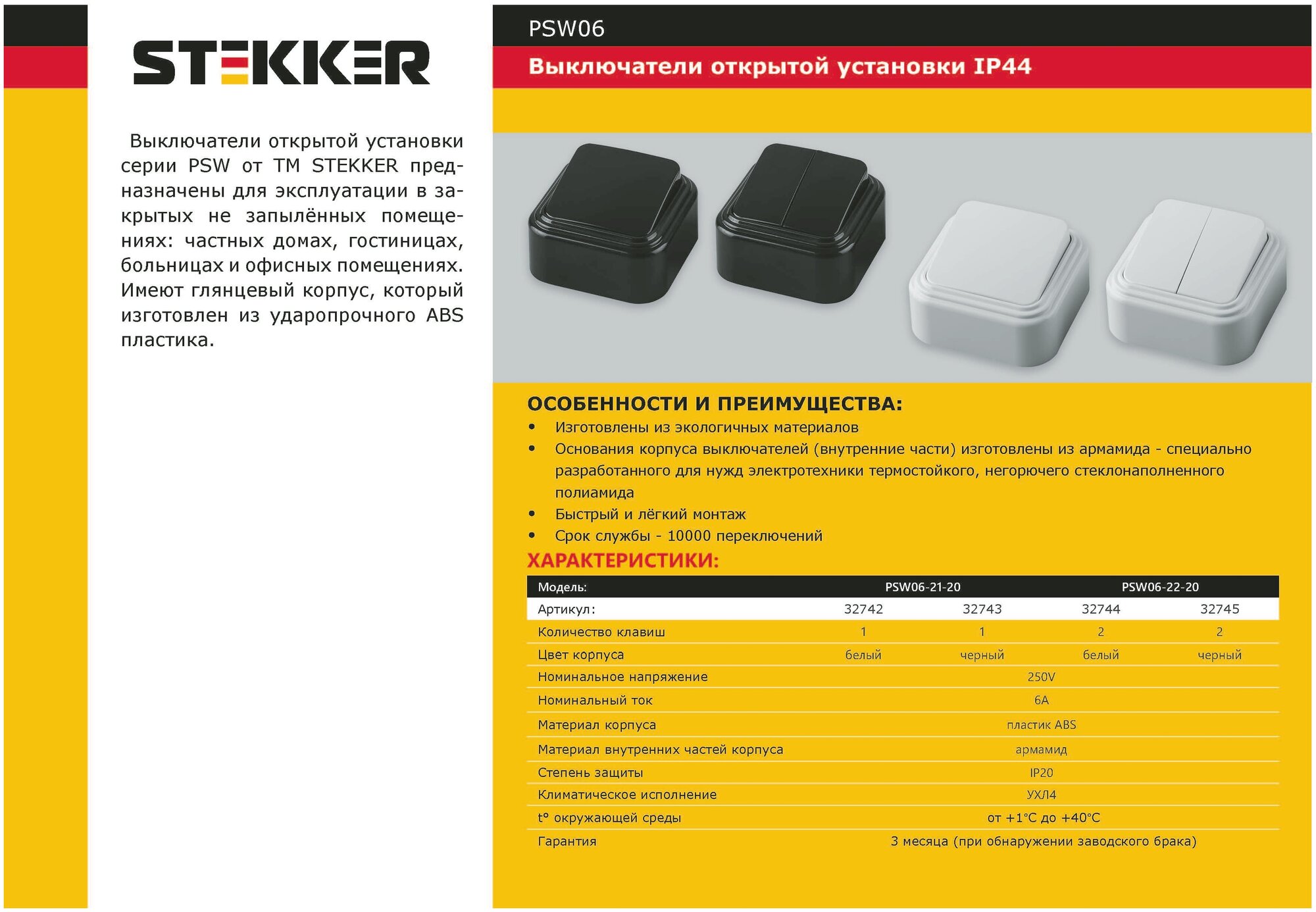 Уникальный дизайн товара Выключатель STEKKER PSW06-22-20 двухклавишный открытой установки, 250В, 6А, IP20, черный (VA 56-232-Ч) - одно из главных преимуществ, которое привлекает покупателей. Производитель STEKKER использует только качественные материалы, что позволяет создать товары с длительным сроком службы. Удобный монтаж – еще одно преимущество товара. Вы сможете самостоятельно установить изделие, а в случае возникновения проблем наши специалисты всегда готовы помочь. Изделие выполнен в универсальном цвете, поэтому подойдет для любого интерьера. Цветные лампочки и другие аксессуары позволят дополнить дизайн. Дополнительные аксессуары и комплектующие приобретаются отдельно, Вы сможете найти все необходимые изделия в нашем каталоге товаров. Дополните интерьер помещения качественными источниками света. Выключатель STEKKER PSW06-22-20 двухклавишный открытой установки, 250В, 6А, IP20, черный (VA 56-232-Ч) от STEKKER - гарантия Вашего комфорта. Товар отлично подойдет как для жилых, так и для офисных помещений. Бренд STEKKER очень популярен. Производитель дает гарантию на каждый товар, что защищает Вас при выявлении скрытых дефектов. Выключатель STEKKER PSW06-22-20 двухклавишный открытой установки, 250В, 6А, IP20, черный (VA 56-232-Ч) . Выключатель STEKKER PSW06-22-20 двухклавишный открытой установки, 250В, 6А, IP20, черный (VA 56-232-Ч) в , указав артикул 32745.