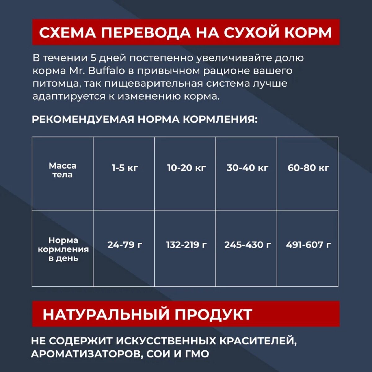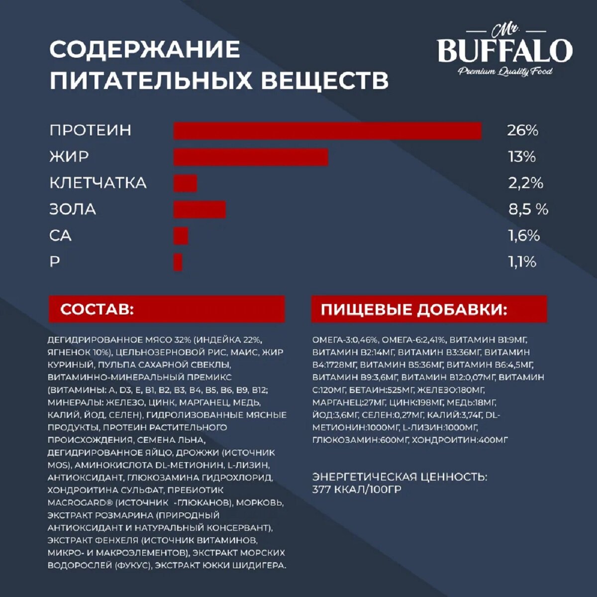 Полнорационный сухой корм Mr.Buffalo SENSITIVE с ягнёнком для взрослых собак всех пород с чувствительным пищеварением. Основу рациона составляет мясо ягнёнка и рис, обладающие низким аллергенным потенциалом, легко перевариваются, снижая нагрузку на пищеварительный тракт. Увеличенное содержание Омега-3 и Омега-6 жирных кислот помогает эффективно бороться с основными симптомами аллергии и пищевой непереносимости: снижает зуд от расчёсов, убирает покраснения кожи, снимает воспаление глаз, ушей, останавливает неконтролируемую линьку.