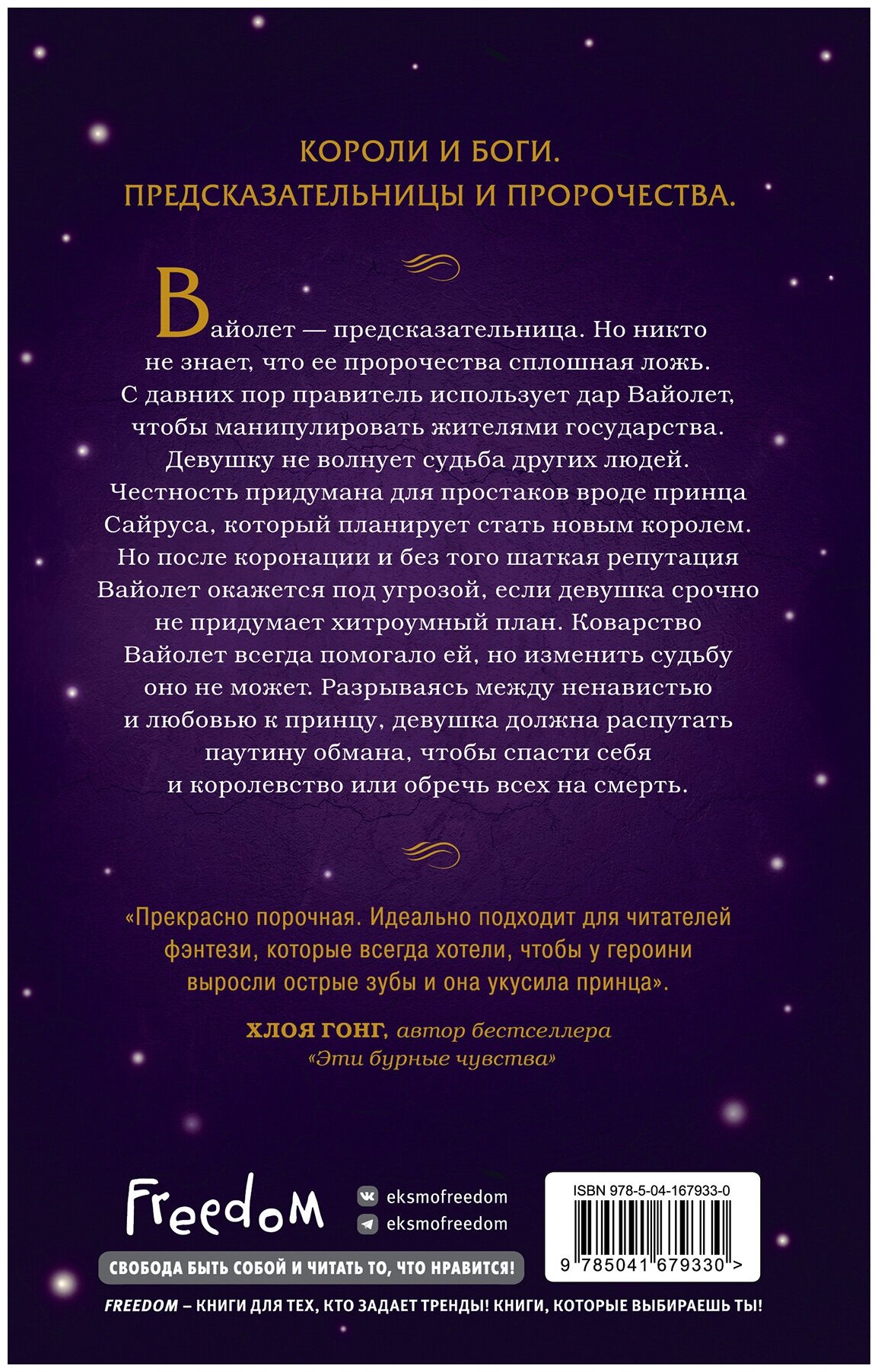 Вайолет — предсказательница. Но никто не знает, что ее пророчества сплошная ложь. С давних пор правитель использует дар Вайолет, чтобы манипулировать жителями государства. Девушку не волнует судьба других людей. Честность придумана для простаков вроде принца Сайруса, который планирует стать новым королем. Но после коронации и без того шаткая репутация Вайолет окажется под угрозой, если девушка срочно не придумает хитроумный план.