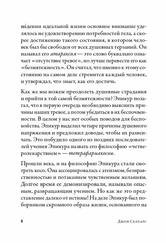 История не была добра к древнегреческому философу Эпикуру: мало кого из мыслителей так превратно понимали потомки. Уже много веков эпикурейцами называют обжор, гедонистов, любителей пожить в свое удовольствие - и все из-за того, что высшим благом в жизни философ считал наслаждение. Но в чем на самом деле состояло наслаждение для Эпикура, призывавшего довольствоваться малым и показывавшего своим ученикам путь к духовной безмятежности? Книга английского философа Джона Селларса правдиво и просто рассказывает о тетрафармакосе - эпикурейском учении, исцеляющем от тревог и страхов и основанном на атомистической теории.