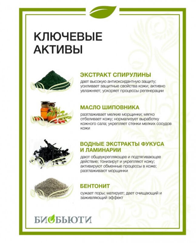 | Состав | гелевая основа, вода дистиллированная, масло соевое, масло шиповника, водные экстракты фукуса и ламинарии, экстракт спирулины, бентонит, альгинат натрия, воск пчелиный, триглицериды каприлик/каприк, лавитол, ксантановая камедь, гуаровая камедь, цеолит, отдушка, морская соль, эфирные масла мяты и лимона, СО2 экстракт лимонника, сульфат цинка, витамин Е, консервант |