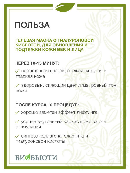 - после курса 10 процедур: упругая, эластичная, увлажненная кожа, заметное улучшение четкости овала лица и сокращение числа мелких морщинок