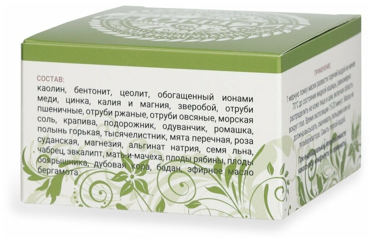 Состав: каолин, бентонит, цеолит, обогащенный ионами меди, цинка, калия и магния, зверобой, отруби пшеничные, отруби ржаные, отруби овсяные, морская соль, крапива, подорожник, одуванчик, ромашка, полынь горькая, тысячелистник, мята перечная, роза суданская, магнезия, альгинат натрия, семя льна, чабрец, эвкалипт, мать-и-мачеха, плоды рябины, плоды боярышника, дубовая кора, бадан, эфирное масло бергамота.