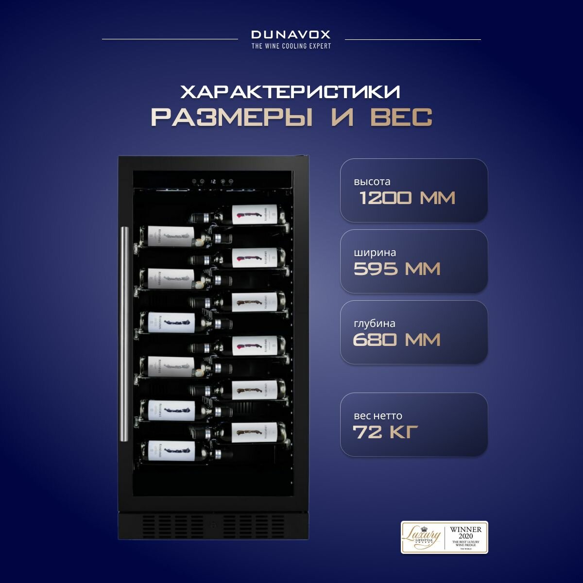 Встраиваемый винный шкаф Dunavox (Дунавокс) способен вместить до 70 бутылок, которые располагаются на выдвижных демонстрационных полках. Шкаф компрессорного типа имеет внутри одну температурную зону. Равномерную подсветку всех полок обеспечивает панорамное освещение синего, янтарного и белого цвета. Освещение включается при открывании дверок.