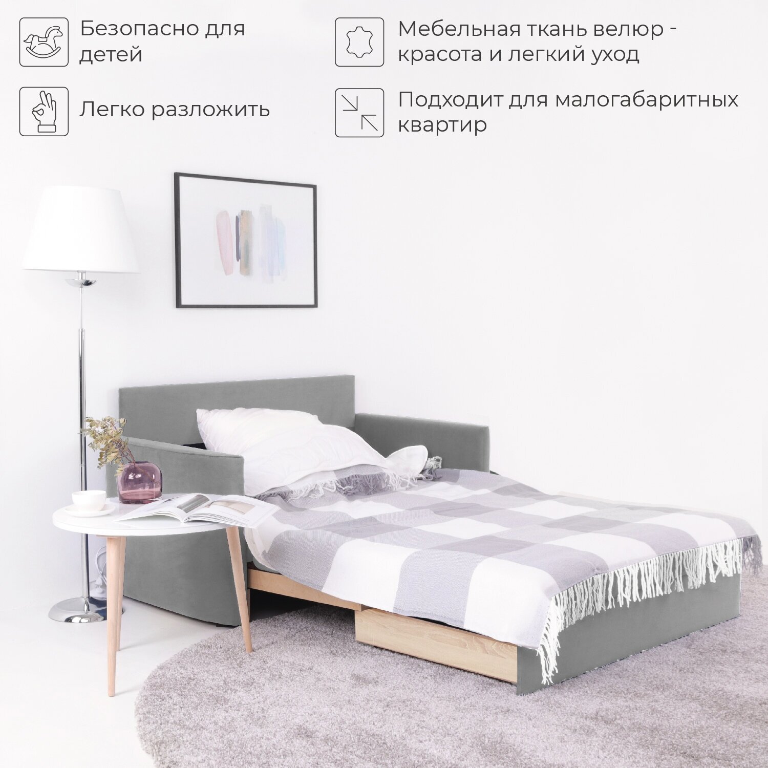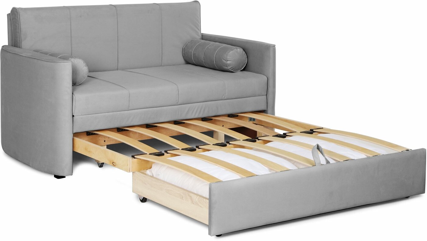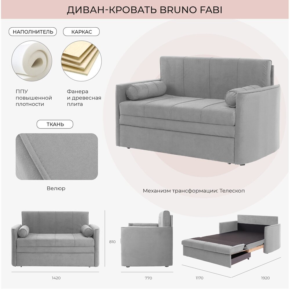 Диван-кровать Nrava Fabi 1420х770х810 ? компактная современная модель для спальни ребенка или подростка. Подходит для небольших помещений: прихожей, кухни, малогабаритной гостиной. Комплектуется декоративными подушками-валиками.Механизм трансформации ?Телескоп? ? один из самых надежных и удобных в эксплуатации. Диван раскладывается путем выдвижения вперед. Принцип работы настолько простой, что с ним справятся даже дети. Размер спального места ? 1920х1170 мм, допустимая нагрузка ? 100кг на посадочное место. В выдвижной части конструкции есть бельевой ящик.Модель изготовлена из прочных, безопасных материалов. Каркас выполнен из бруса, толстой фанеры и мебельной плиты. Под обивкой из велюра проложен слой упругого мебельного ППУ. Фанерные ламели улучшают ортопедические свойства спального места и способствуют свободной циркуляции воздуха. Велюровая ткань легко поддается чистке пылесосом и нейтральным мыльным раствором, что актуально для детского дивана.