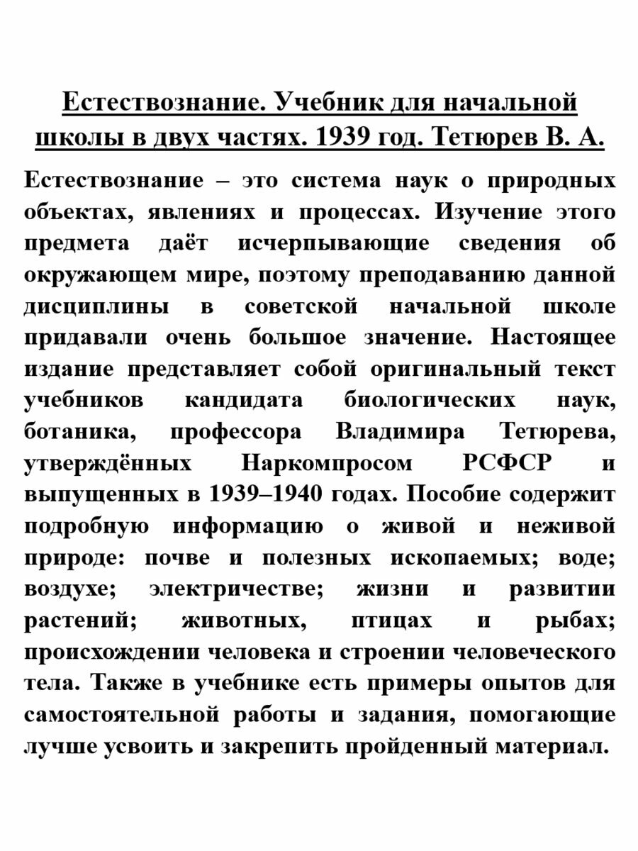 Естествознание – это система наук о природных объектах, явлениях и процессах. Изучение этого предмета даёт исчерпывающие сведения об окружающем мире, поэтому преподаванию данной дисциплины в советской начальной школе придавали очень большое значение. Настоящее издание представляет собой оригинальный текст учебников кандидата биологических наук, ботаника, профессора Владимира Тетюрева, утверждённых Наркомпросом РСФСР и выпущенных в 1939-1940 годах. Пособие содержит подробную информацию о живой и неживой природе: почве и полезных ископаемых; воде; воздухе; электричестве; жизни и развитии растений; животных, птицах и рыбах; происхождении человека и строении человеческого тела. Также в учебнике есть примеры опытов для самостоятельной работы и задания, помогающие лучше усвоить и закрепить пройденный материал.