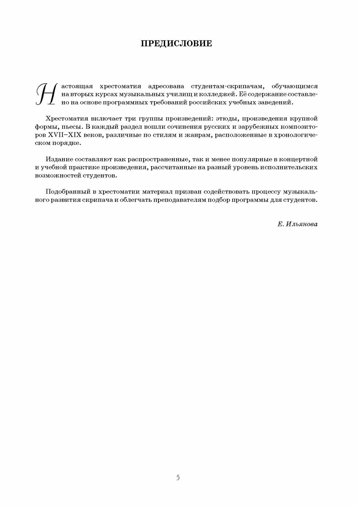 В хрестоматию включены избранные сочинения русских и зарубежных композиторов, входящие в программы музыкальных училищ. Сборник содержит этюды, произведения крупной формы, пьесы. Издание адресовано преподавателям и студентам-скрипачам вторых курсов музыкальных училищ и колледжей.