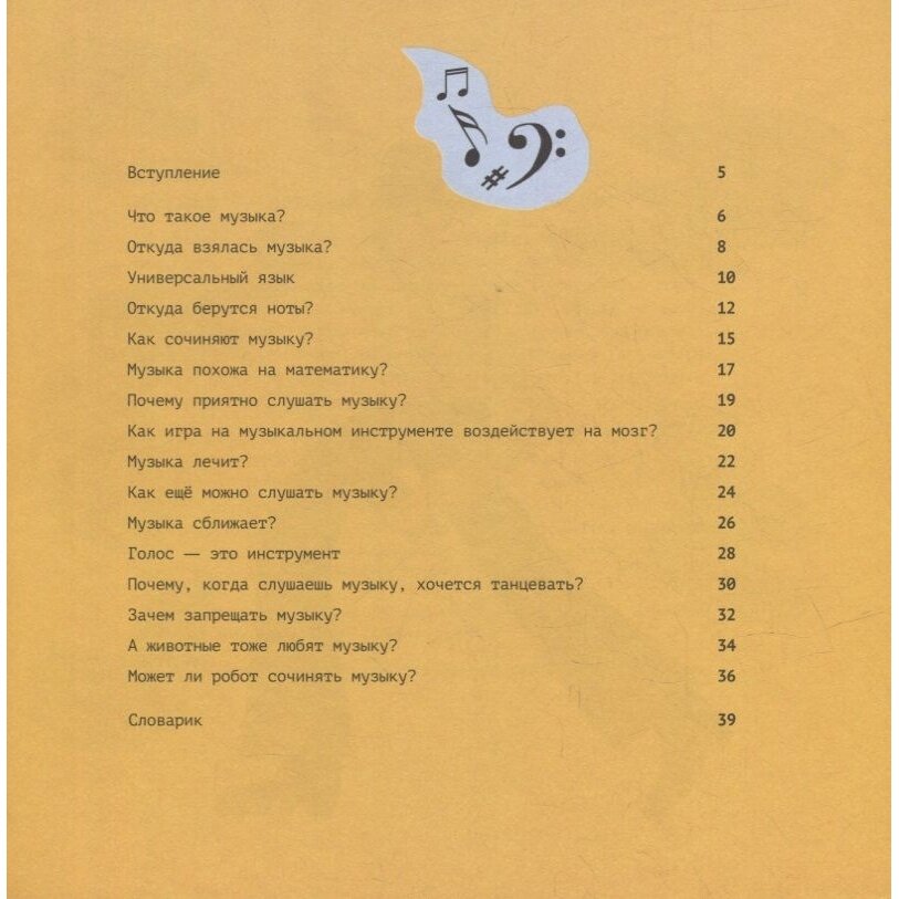 Сегодня музыка сопровождает нас повсюду, она звучит в кино, в кафе, на стадионе - и у каждого из нас дома. Подпевать песням по радио, насвистывать любимые мелодии, отстукивать ритм, танцевать под музыку или даже делать под неё уроки - всё это часть нашей повседневной жизни. И всё-таки что это такое - музыка, кто её придумал, как именно она воздействует на человека и животных? Что нужно знать и уметь, чтобы сочинять музыку самому? Правда ли, что музыка может быть целебной или наоборот, вредной и опасной?