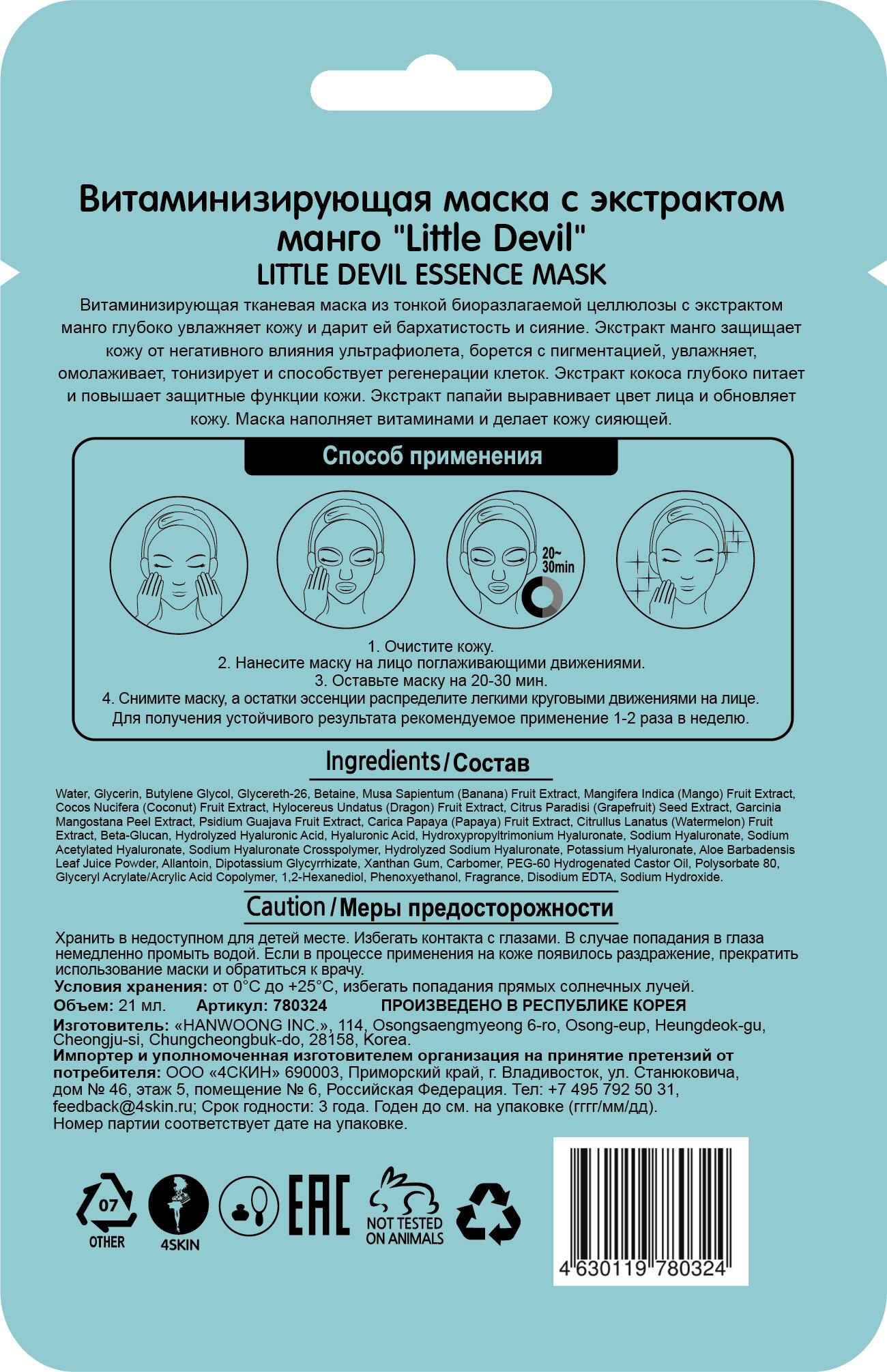 На сегодняшний день товар «Little Devil Витаминизирующая маска с экстрактом манго 21 мл (Little Devil ) (ЭХ99989428637)» можно купить с кешбеком в 1 магазине: Яндекс.Маркет