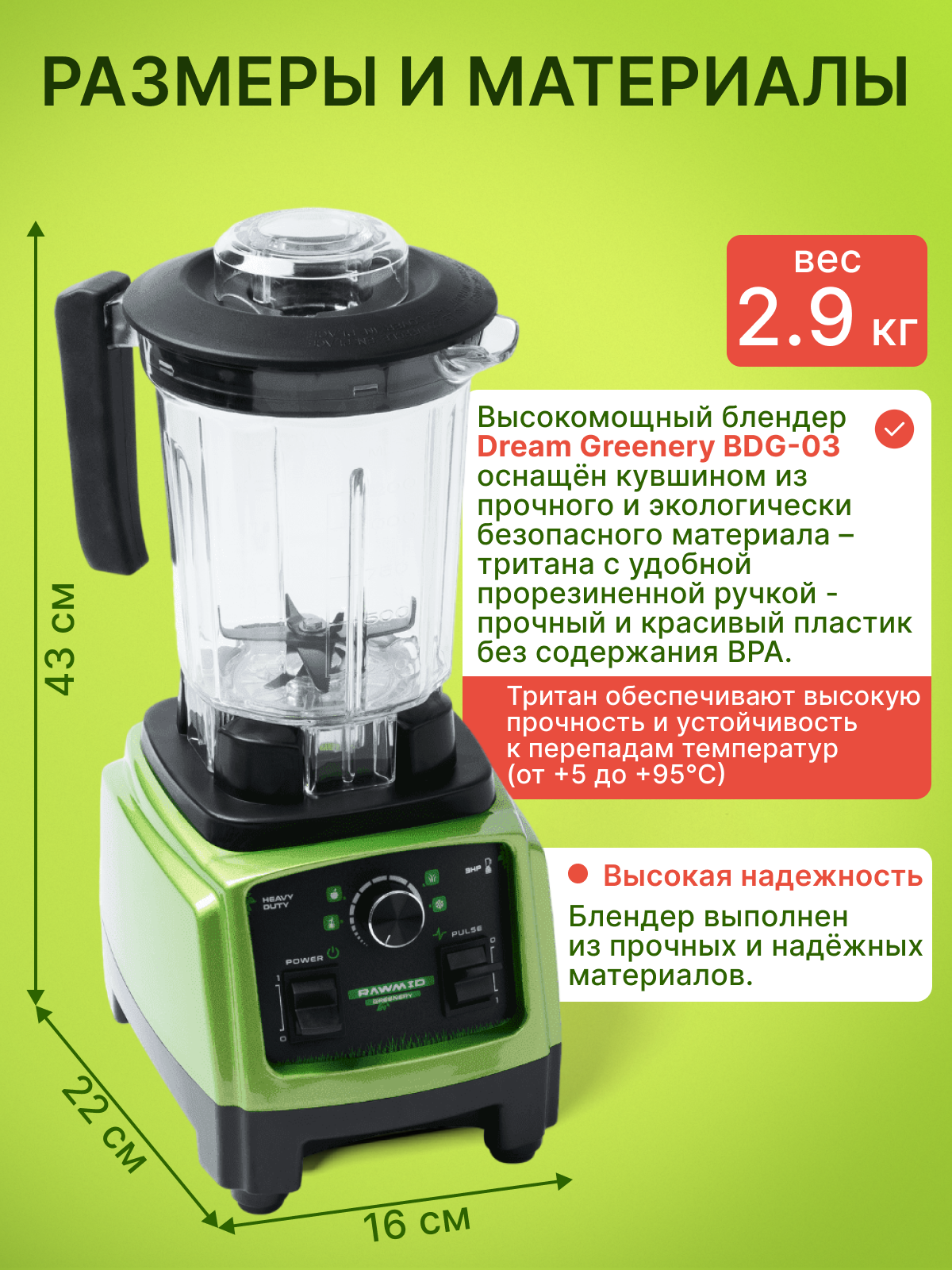 Благодаря небольшим габаритам, мощный блендер RawMiD Dream Greenery 2 легко уместится даже на маленькой кухне. Размеры блендера составляют всего 16 × 22 × 43 см.