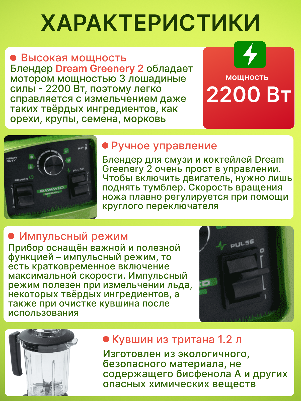 Блендер Dream Greenery 2 обладает мотором мощностью 3 лошадиные силы (2200 Вт), поэтому легко справляется с измельчением даже таких твёрдых ингредиентов, как орехи, крупы, семена, морковь.