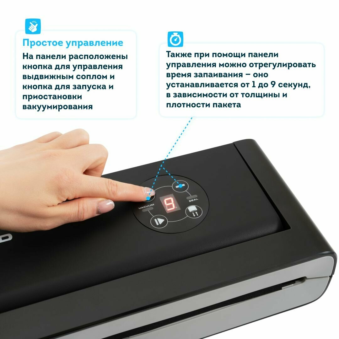 Прибор хороший, функциональный. Высокая мощность. Прост в обращении. Удобная простая панель управления: в центре отображается время запаивания, индикаторы увеличения (уменьшения) времени вакуумирования; индикатор вакуумирования; индикатор запаивания; индикатор работы сопла; старт- пауза. Имеется фильтрующая чаша для сбора жидкости. В комплект входит так же игла для чистки, стартовый набор пакетов. Вообщем покупкой доволен.