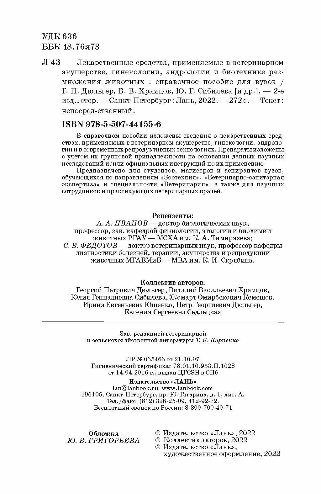 Лекарственные средства применяемые в ветеринарном акушерстве гинекологии андрологии и биотехнике (Дюльгер Георгий Петрович, Храмцов Виталий Васильевич, Сибилева Юлия Геннадиевна); Лань, 2022