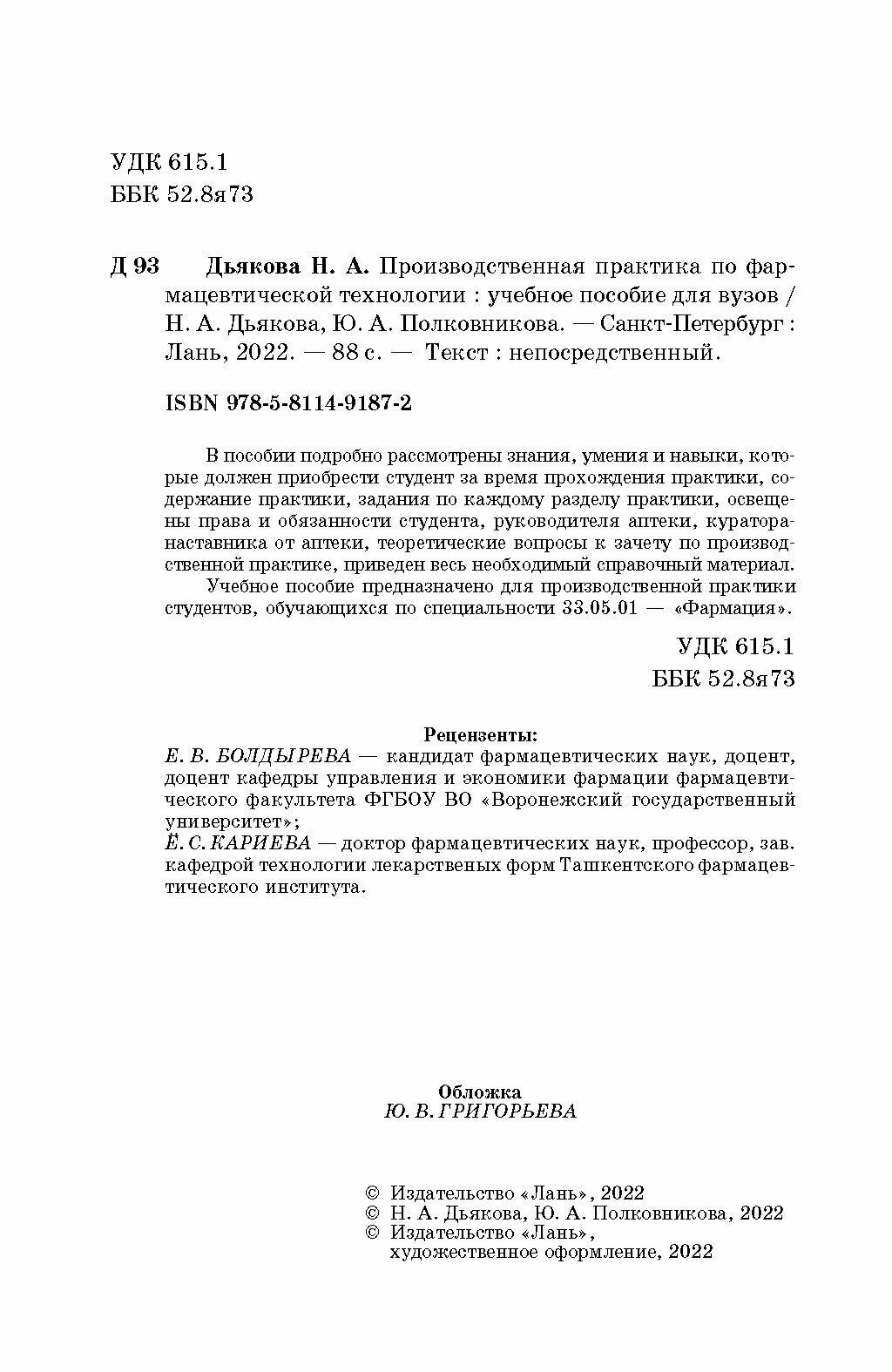 Производственная практика по фармацевтической технологии (Нина Алексеевна Дьякова, Юлия Александровна Полковникова); Лань, 2022