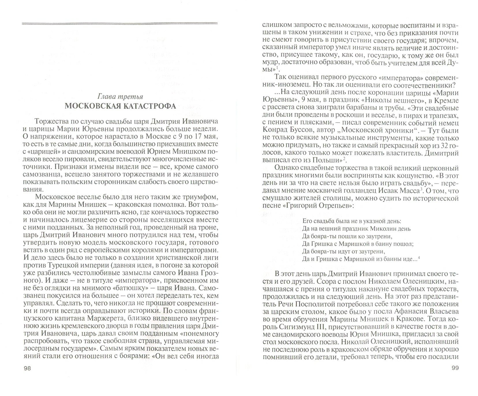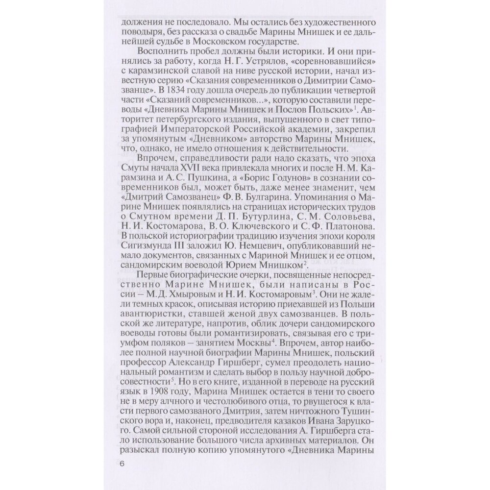 Что касается содержания, то можно сказать словами Флобера: «Пьедестал слишком велик для статуи». Действительно, в книге более 300 страниц, и при этом шрифт отнюдь не велик. И, конечно, представить столь обширное жизнеописание Марины Мнишек не представляется возможным – хотя бы в силу банального недостатка информации. Впрочем, назвать книгу именно биографией Марины проблематично. Она скорее проходит по страницам, то появляясь во всей красе, то надолго исчезая, и как бы оттеняет события русской смуты, которые применительно к жизненному пути героини описаны весьма подробно. И в то же время перед нами предстает вполне человеческий портрет женщины, оказавшейся не в лучшее время не в лучшем месте и попавшей в круговорот российской истории, как кур в ощип. Это, конечно, отличается от устоявшегося образа пушкинской «гордой полячки». А мы можем в известной степени под новым углом взглянуть на перипетии нашей истории и на роль Марины Мнишек в ней.