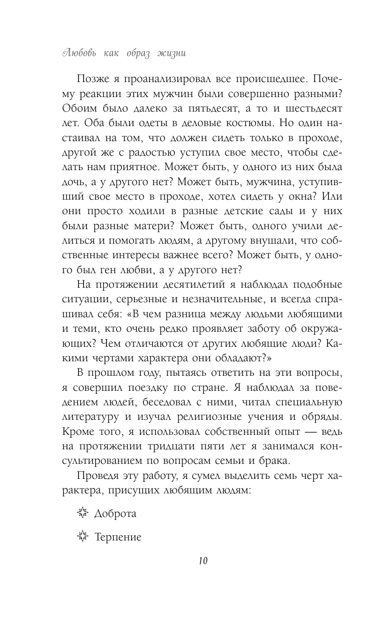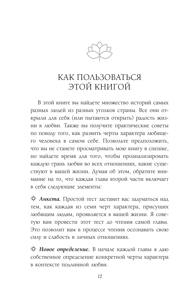 Что мы имеем: кухонная психология, написанная настолько деревянным языком, что его поймёт даже собака, если читать ей книгу вслух, идеи наподобие — доброта хорошо, а зло — плохо. Если честно, читал изначально со скептицизмом, но вот дошёл до примера автора, в котором он рассказал о женщине, которая так "любила" своего сына-наркомана, что "знала" что где-то в глубине он всё ещё тот другой каким она его знала, приведённый автором как великую картину того что он называет любовью и что по сути является игнорированием взросления сына и отрицанием как его проблем (а он в конце истории умер), того что он изменился и стал другим, а значит и отсутствием попытки построить отношения с новым, изменившимся сыном если не с целью найти и докопаться до причин, приведшим его к наркотикам, то хотя бы с целью найти экологичность в общении для обоих. После примера книгу бросил, никому не рекомендую.