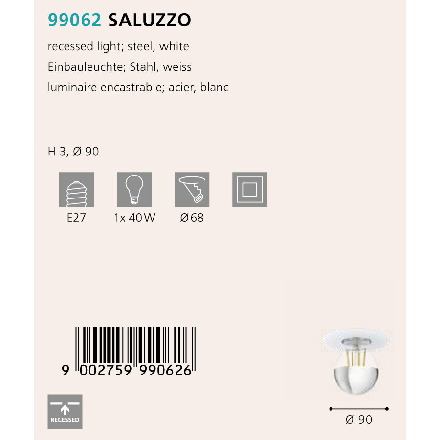 Встраиваемый светильник Eglo 99062 серии SALUZZO. Будет хорошим решением для квартиры. Размеры 9x9x0.3 cm. Диаметр 9 cm Без плафона без плафона, а материал/цвет арматуры сталь/белый. Использует лампу с цоколем E27. Идеально подходит для кухни. Страна происхождения бренда — АВСТРИЯ.