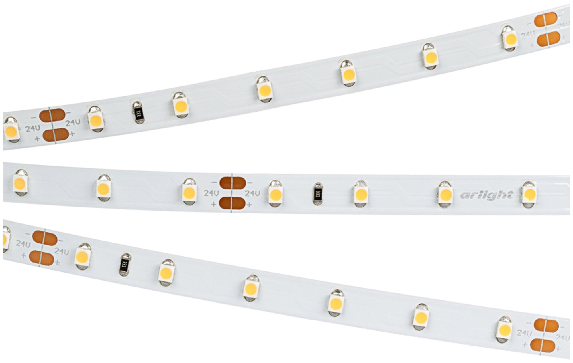 Светодиодная лента RT-A60, открытая. Светодиоды 2835, 60 шт/м (300 шт на 5 м), белая плата, ширина 8 мм, скотч 3M. Цвет ТЁПЛЫЙ 2700 K, цветопередача CRI 95..98, угол 120°. Питание 24V, мощность 4.8 Вт/м (24 Вт на 5 м). Размеры 5000x8x1.5 мм. Мин. отрезок 100 мм, 6 светодиодов. Цена за 1 м.