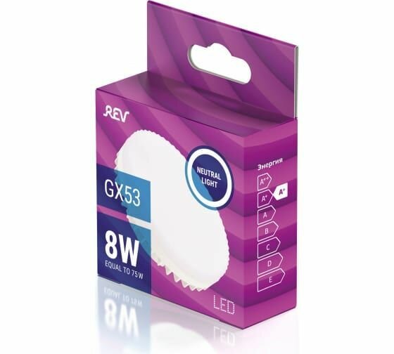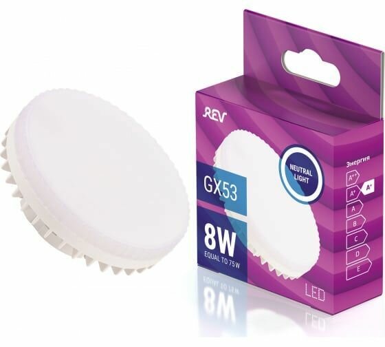 Энергосберегающая светодиодная лампа REV GX53 мощностью 8 Вт ? это отличный вариант экономичного и долговечного освещения для дома, офиса, складских и общественных помещений. В отличие от обычных ламп накаливания светодиодные лампочки потребляют в 10 раз меньше электроэнергии, но при этом сохраняют такую же интенсивность свечения. При использовании в быту такая лампа способна прослужить до 30000 часов, а это значит, что можно будет не беспокоиться о замене источников освещения целых 15 лет. Теплый белый свет с цветовой температурой 4000 Кельвинов рассеивается по помещению, создает уютную атмосферу и комфортное для глаз освещение. Еще одна характеристика светодиодных лампочек, которая определяет уровень комфорта восприятия ? это световой поток, то есть степень освещенности комнаты на квадратный метр. Этот показатель важно учитывать, если люди подолгу находятся в помещении. 640 Лм (люменов) на м2 ? это благоприятный уровень освещенности, который особенно хорошо подходит для рабочих помещений, детских и игровых комнат.