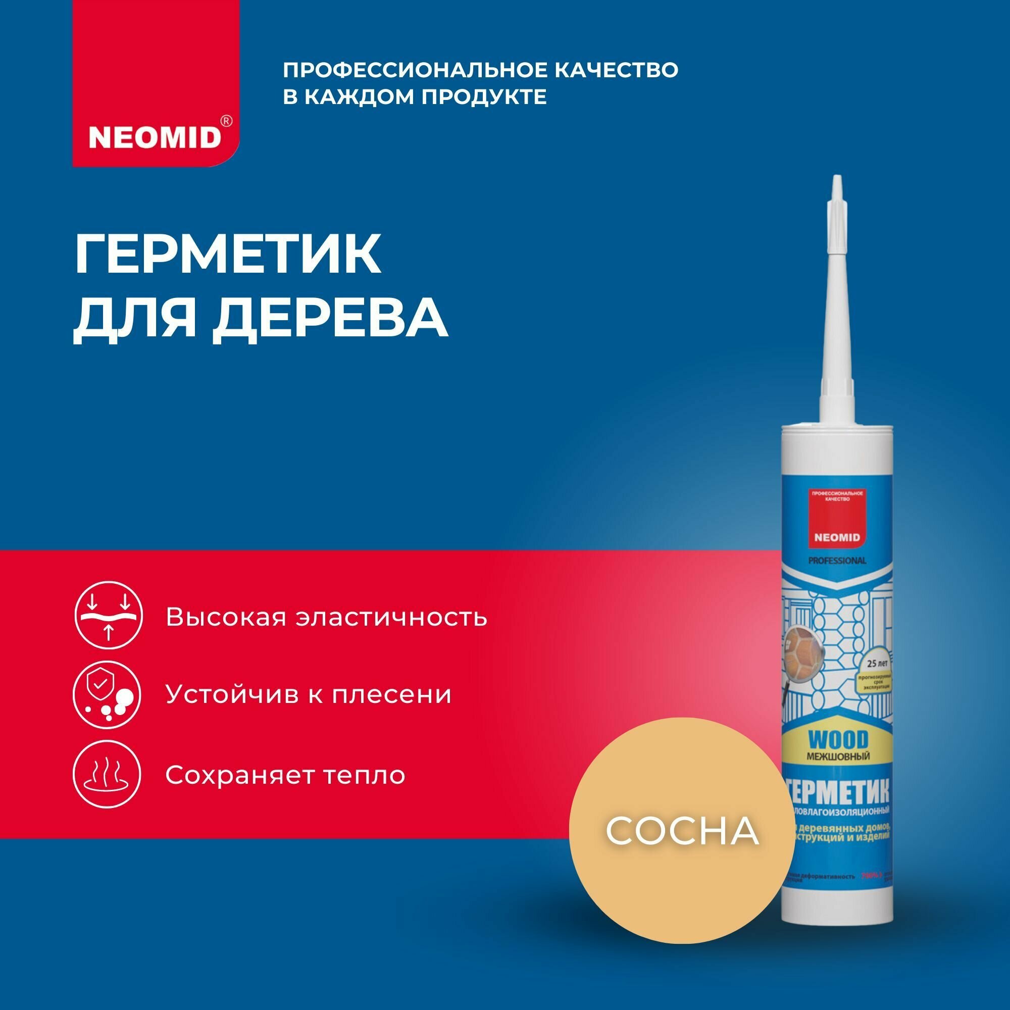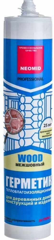 Герметик Neomid Wood межшовный - предназначен для деревянных поверхностей, для заделки и долговременной герметизации.Имеет высокую адгезию, а также эластичность до 700%, устойчив к УФ излучению.Защищает от образования плесени, от проникновения влаги и холода , помогает сохранить тепло.подготовка основания:Рабочая поверхность должна быть предварительно очищена.Разрешено наносить герметик на сухую и на увлажненную поверхность в случае жаркой погоды.нанесение:Герметик наносится на подготовленную поверхность из картриджа, обеспечивая контакт герметика с древесиной только в двух точках.Рекомендуемый размер отверстия наконечника картриджа – 4 мм.После нанесения удалить излишки, разгладить поверхность герметика и придать форму специальным шпателем. Для предотвращения прилипания герметика к инструменту используют мыльную воду.Герметик можно наносить при температуре воздуха и основания от +5С до +30С. во время дождя и снега нанесение противопоказано. При низких температурах вязкость герметика повышается, поэтому перед применением рекомендуется выдержать герметик в отапливаемом помещении не менее суток.Время отверждения 2 мм в сутки.Не допускается разбавление герметика!Прогнозируемый срок эксплуатации 25 лет и более.Возможно как колерование герметика водно-дисперсионными пастами, так и поверхностная окраска.расход:Расход рассчитывается индивидуально, зависит от ширины и глубины шва.состав:Сополимерная акриловая дисперсия, двуокись титана, наполнители, технологические добавки, консервант, вода.хранение И транспортировка:• В плотно закрытой таре при температуре окружающего воздуха от +5oС до +30oС.• Предохранять от воздействия тепла, прямых солнечных лучей и влаги.• Допускается до 7 циклов замораживания–размораживания при температуре до -180С без вскрытия первичной упаковки.• Размораживание проводить в оригинальной таре при комнатной температуре.меры предосторожности:• Герметик пожаро– и взрывобезопасен.• При работе использовать спецодежду, перчатки, очки.• Избегать попадания на кожу и в глаза.• При попадании на кожу или в глаза промыть водой.• Работы проводить в проветриваемом помещении.Гарантийный срок хранения – 12 месяцев.
