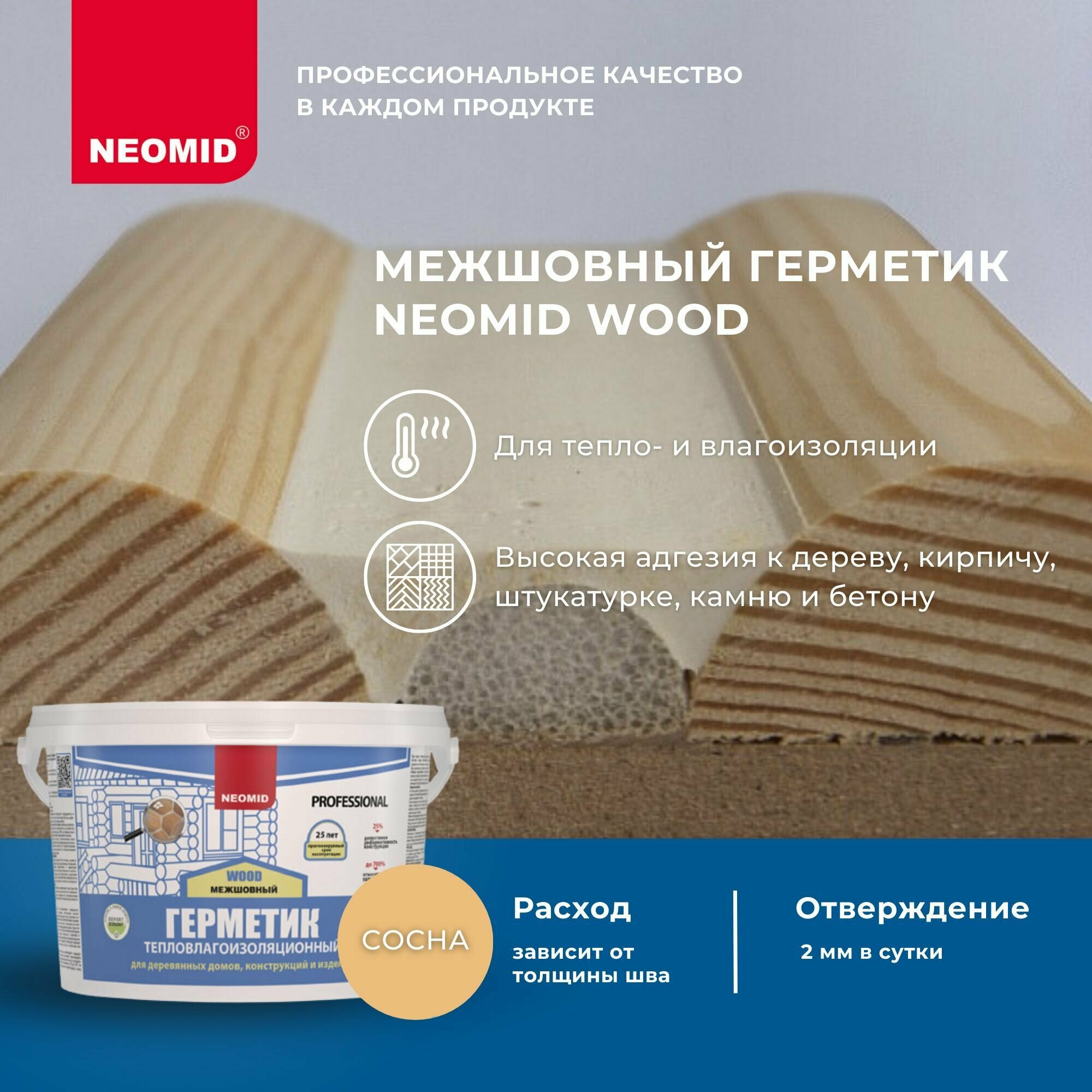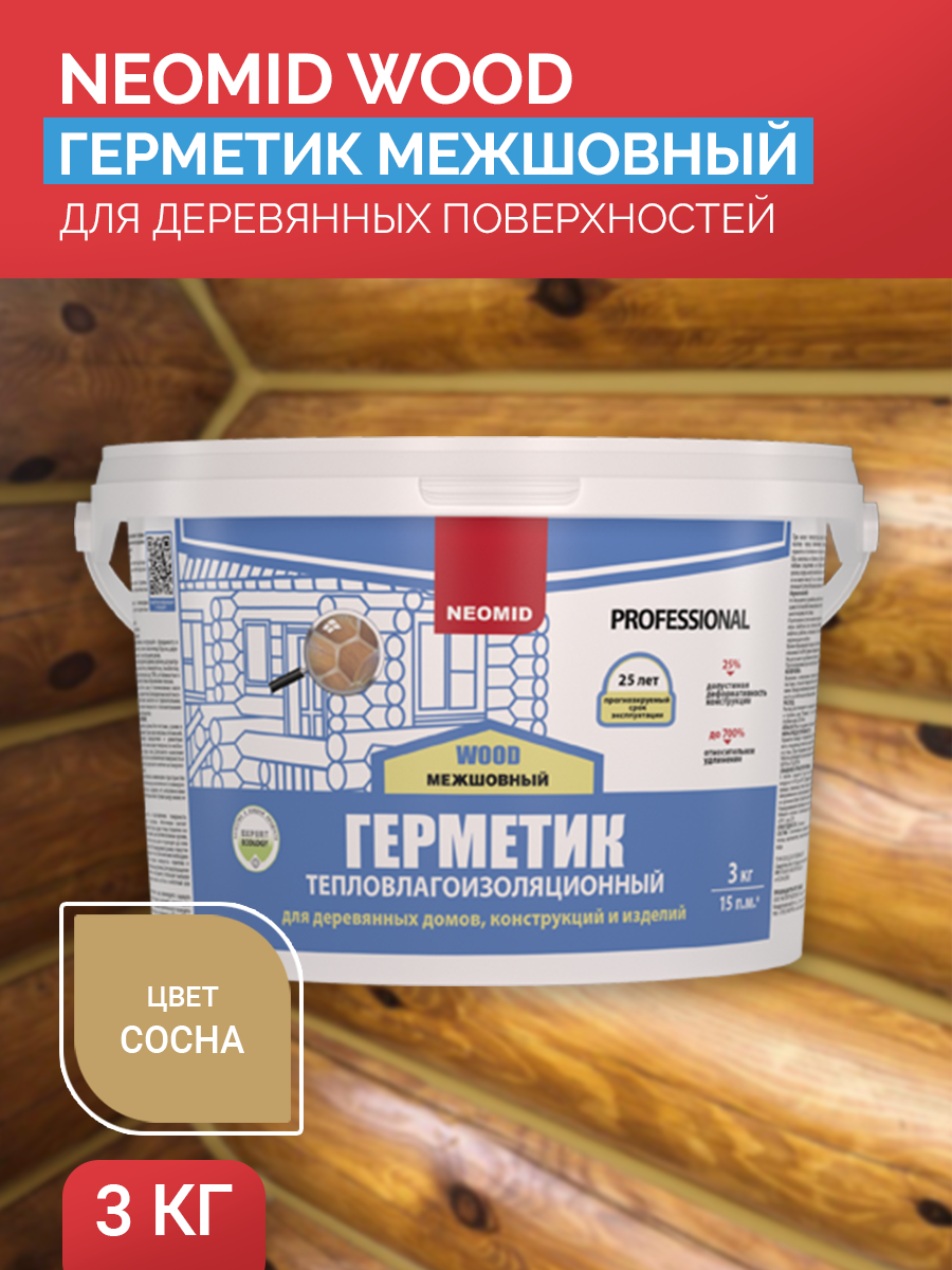 Герметик межшовный для деревянных поверхностей NEOMID WOOD предназначен для заделки и долговременной герметизации (тепло-водо-воздухозащиты): деформационных швов в строительных конструкциях с деформативностью до 25%; межбревенных и межвенцовых стыков сруба (внутри и снаружи помещений); трещин в бревнах; торцевого спила бревен; обходов окон и дверей; примыканий деревянных конструкций к фундаменту и кровельным элементам, а также стыков между брусом, деревянными панелями и т. п. в конструкциях домов. Герметик имеет высокую адгезию к дереву, кирпичу, штукатурке, натуральному камню, бетону, полимербетону, пенобетону, ПВХ. Обладает высокой эластичностью (до 700%), устойчивостью к УФ излучению. Герметик устойчив к образованию плесени. Надежно защищает стыки и швы от проникновения влаги и холода, хорошо сохраняет тепло. Благодаря высокой тиксотропности герметик можно наносить на горизонтальные, вертикальные и наклонные поверхности с положительными и отрицательными углами наклона.