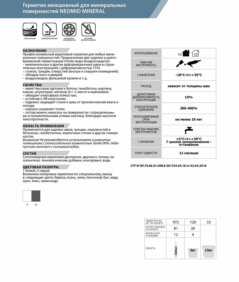 Герметик межшовный для минеральных поверхностей NEOMID MINERAL Предназначен для заделки и долговременной герметизации (тепло-водо-воздухозащиты): • Межпанельных и других деформационных шов в строительных конструкциях с деформативностью 15%. • Стыков, трещин, отверстий (внутри и снаружи помещений). • Обходов окон и дверей. • Воздуховодов, фальцевой кровли и т. д. Герметик имеет высокую адгезию к бетону, пенобетону, кирпичу, камню, штукатурке, ПВХ, металлу (в т. ч. жести и оцинковке). Обладает атмосферостойкостью, устойчив к УФ излучению, используется для наружных и внутренних работ. Для надежной заделки щелей диаметром более 0,5 сантиметров и профилактики растрескивания герметика рекомендуем использовать уплотнительный шнур из вспененного пластика. Надежно защищает стыки и швы от проникновения влаги и холода, хорошо сохраняет тепло. Благодаря высокой тиксотропности герметик можно наносить на горизонтальные, вертикальные и наклонные поверхности с положительными и отрицательными углами наклона. Подготовка основания: Поверхности, на которые наносится герметик, должны быть чистыми, сухими и прочными, очищенными от грязи, пыли, жировых отложений, старых отслаивающихся лакокрасочных и цементных покрытий. При работе в зимнее время поверхности необходимо очистить от наледи и снега. Допускается нанесение герметика как на сухую, так и на увлажнённую поверхность в случае жаркой погоды. Не допускается наличие на поверхности капельной влаги! Для достижения максимальной эластичности необходимо обеспечить двухстороннюю адгезию герметика к основанию. Для экономичного расхода перед нанесением герметика в щели и швы пространство заложить уплотнительный шнур из вспененного полимерного материала соответствующего диаметра, шнуры небольшого диаметра необходимо сплетать «косичкой». В случае необходимости шнур приклеить при помощи специального клея (при герметизации мелких трещин шнур можно не закладывать).