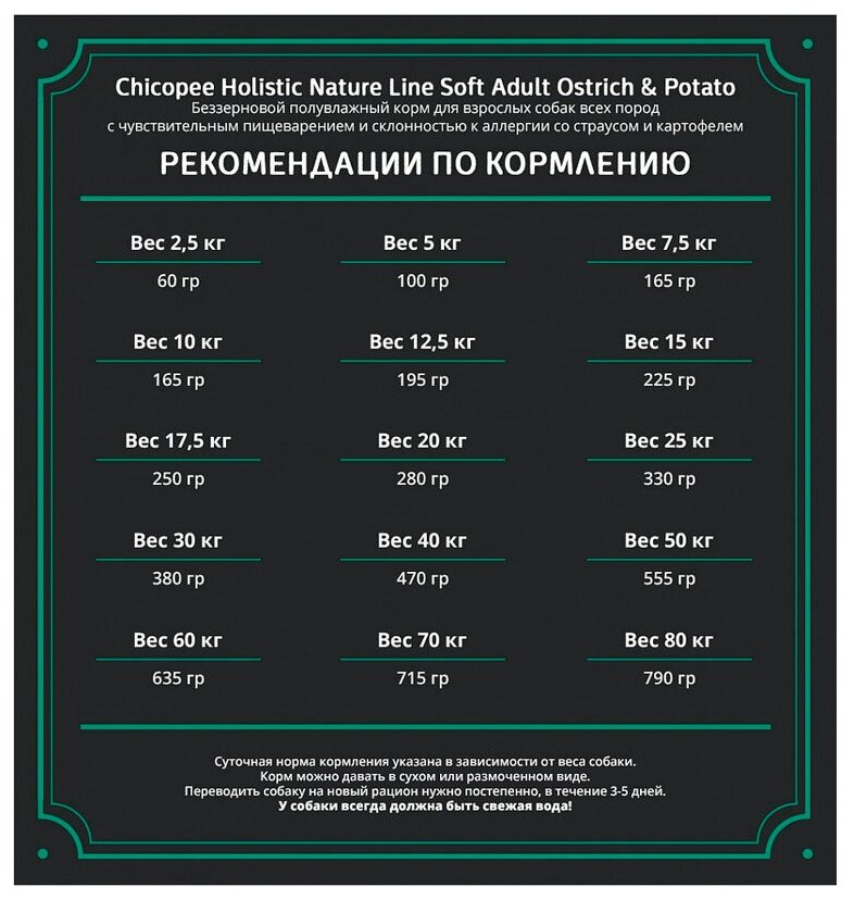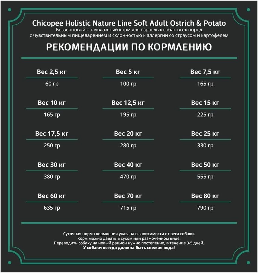 Chicopee HNL Soft Adult Ostrich & Potato полувлажный беззерновой монобелковый корм для взрослых собак с мясом страуса и картофелем. Для взрослых собак всех пород с чувствительным пищеварением. Содержит только один вид белка мясо страуса. Мягкие гранулы (18% влаги). 25% белка / 15% жира. Без злаков. Наш рацион Adult Ostrich & Potato оптимальный выбор для собак с чувствительным желудком. Мясо страуса единственный источник белка животного происхождения монопротеиновая формула! В качестве легкоусвояемого источника углеводов мы использовали картофель. Полувлажный рацион (18 % влаги) Adult Ostrich & Potato уникальный вкусовой опыт для вашего питомца. Особенно подходит для собак, склонных к проблемам с пищеварением или непереносимостью определенных видов белка, благодаря особой монопротеиновой формуле. Мы уверены, что создали замечательную формулу для здоровой и счастливой жизни. Преимущества Chicopee HNL SOFT Adult Ostrich & Potato: Мягкие гранулы. Благодаря увеличенной влажности (влага 18%) некоторые наши рационы дарят животному особые вкусовые ощущения и новый опыт. Монобелковый корм. Подходит для собак с непереносимостью конкретных белков. Стабильная микрофлора кишечника. Цикорий содержит высокоэффективные пищевые волокна (Инулин), который поддерживают необходимую флору в кишечнике. Сбалансированная кишечная флора является основой стабильного пищеварения. Без злаков. Мы используем хорошо усвояемый картофель как источник углеводов и намеренно избегаем применения злаковых в этой линии. Это позволяет обеспечить бережное питания для собаки.