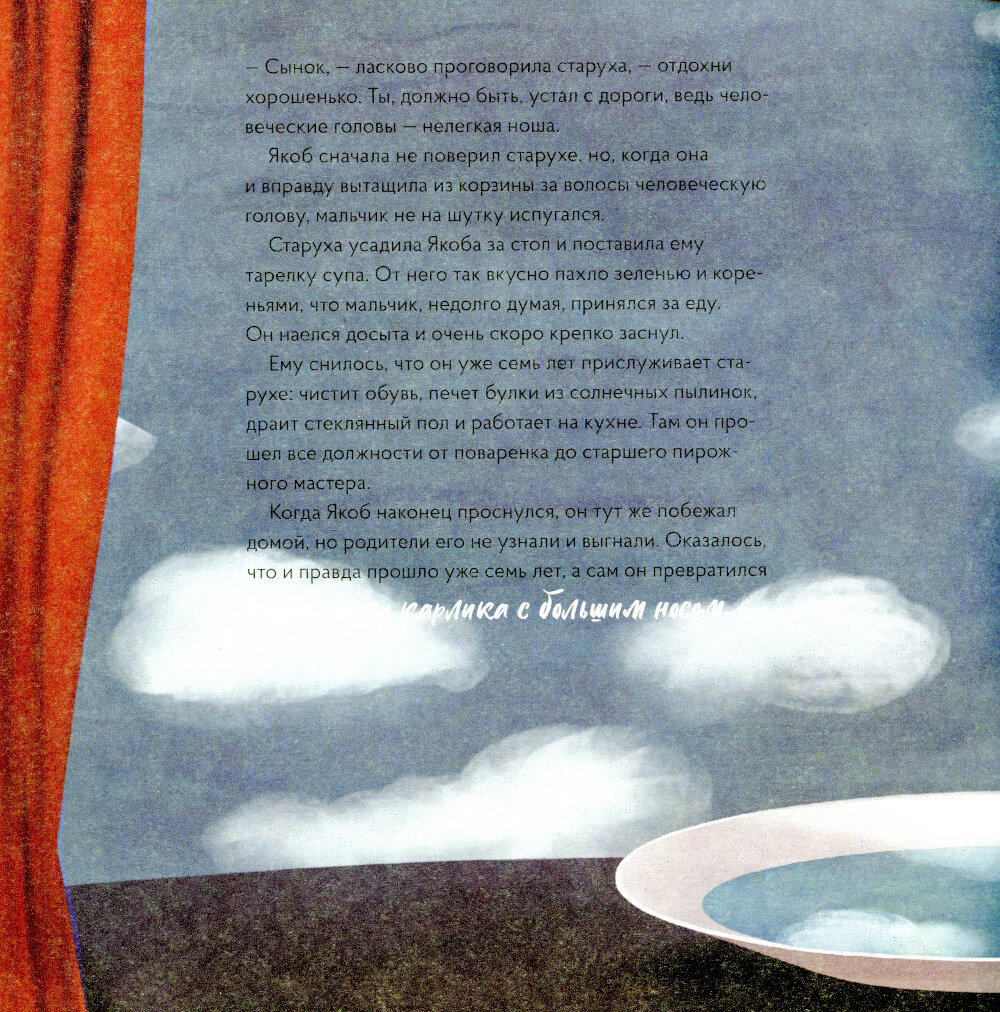 В сказке «Карлик Нос» странные и удивительные вещи происходят на каждой странице — прямо как на полотнах Рене Магритта. Сны и видения, превращения и трансформации, чудеса и тайны — чем не сюжет одной из картин мастера сюрреализма? Вместе с героями сказки мы приглашаем вас в удивительный мир Магритта, где в небе парит человек без лица в костюме и котелке, иногда идет дождь из багетов, а нос вдруг превратится в столовую ложку в тарелке супа. Сравнивайте картинки из книги с оригиналами работ великого мастера, ищите общие детали и улавливайте различия, обсуждайте цветовую палитру и особенности эпохи. Для этого не нужно быть искусствоведом, достаточно увлечься сказкой и иллюстрациями. В конце книги можно прочитать об основных этапах творческого развития художника и узнать интересные факты о нем. Сюда же мы поместили репродукции оригинальных работ, которыми вдохновлялся наш иллюстратор. А также наведите камеру на QR-код и посетите наш бесплатный виртуальный Музей VoiceBook. В зале музея можно подходить к картинам, рассматривать их и слушать аудиогид, разработанный искусствоведом специально для детей! Вас ждет большой мир искусства в компактной книге.
