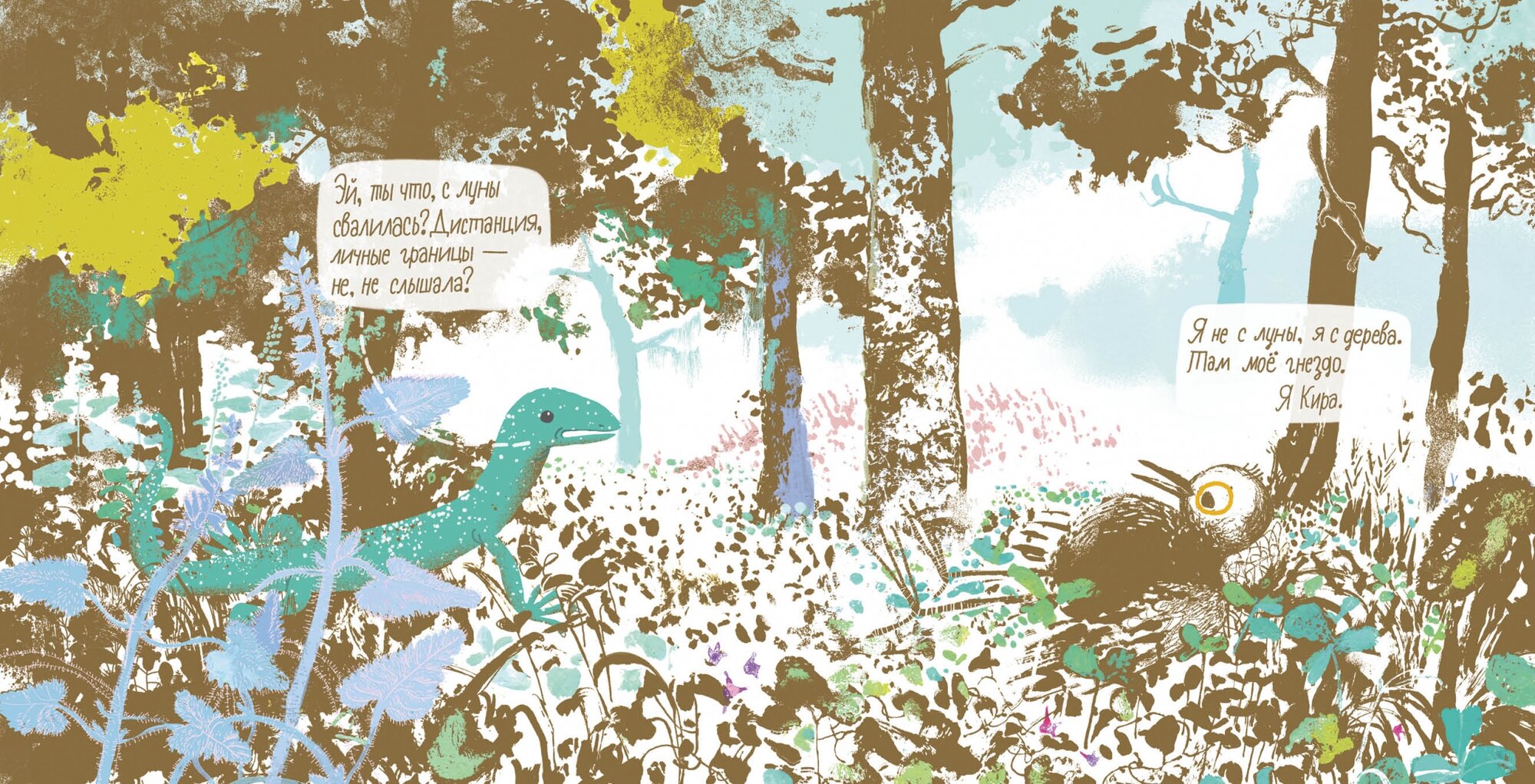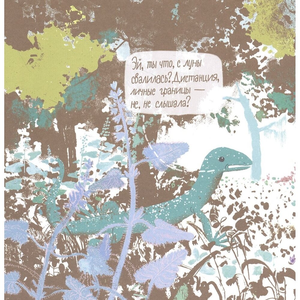 Из героев мне безумно нравится ящерица: прямолинейная, всё говорит в лоб, выглядит очень забавно. Диалоги живые, смешные местами (особенно с ящерицей!). Вкрапления научпопа выглядят органично, есть даже пара удивительных фактов (в лесу есть есть спа!!!).