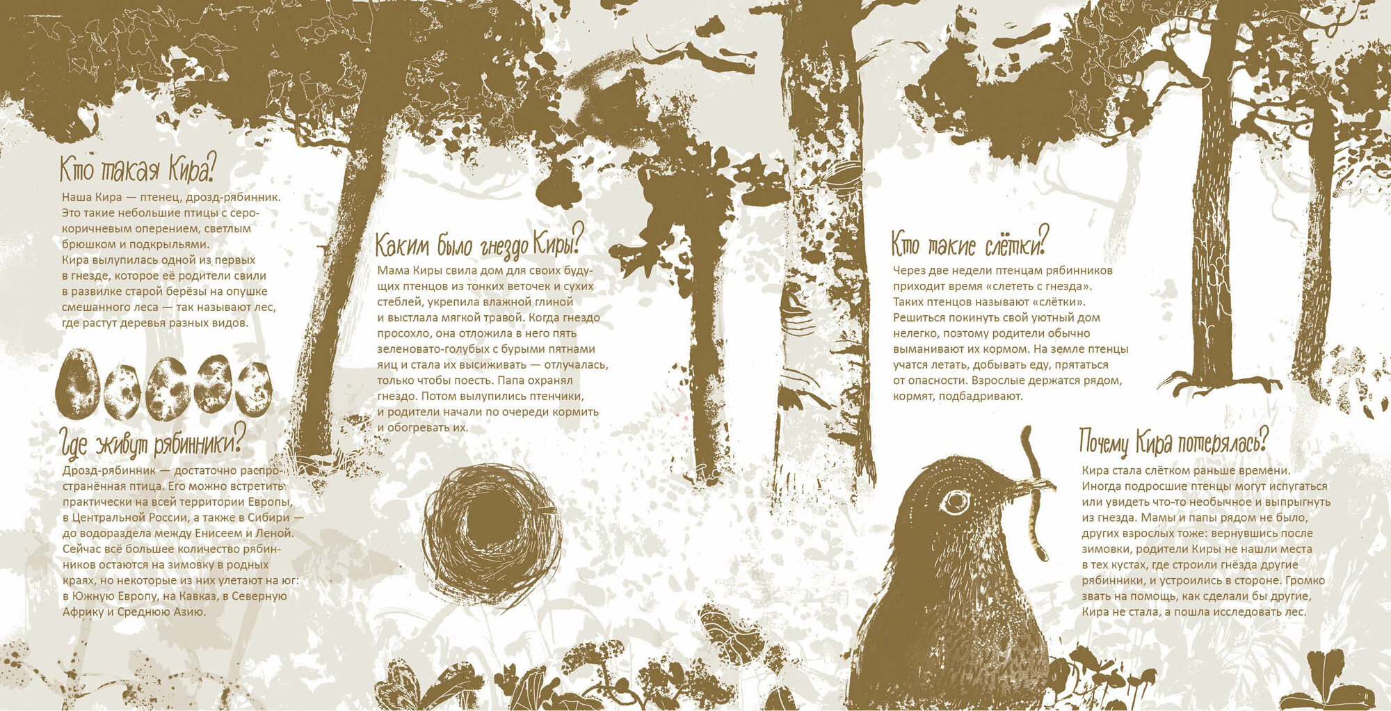 Для взрослого дрозда это был бы самый обычный день, но Кира - слёток. Она только что выпала из гнезда и сегодня её ждёт первое большое приключение! Наблюдая за историей Киры, её новыми знакомствами и открытиями, мы узнаём, как устроен этот удивительный мир - мир леса. Здесь каждый кому-то обед, но дружба выгоднее вражды. Домом может стать любое укромное место, но иногда даже дом - опасность. И есть настоящее спа!
