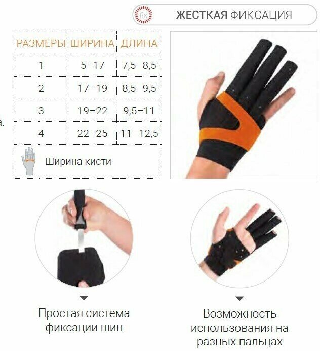 | Показания к применению | иммобилизация после травм и операций i пястно-фалангового сустав; травмы запястно-пястного и пястно-фалангового суставов; травмы связочно-мышечного аппарата ii - iv пальцев руки |