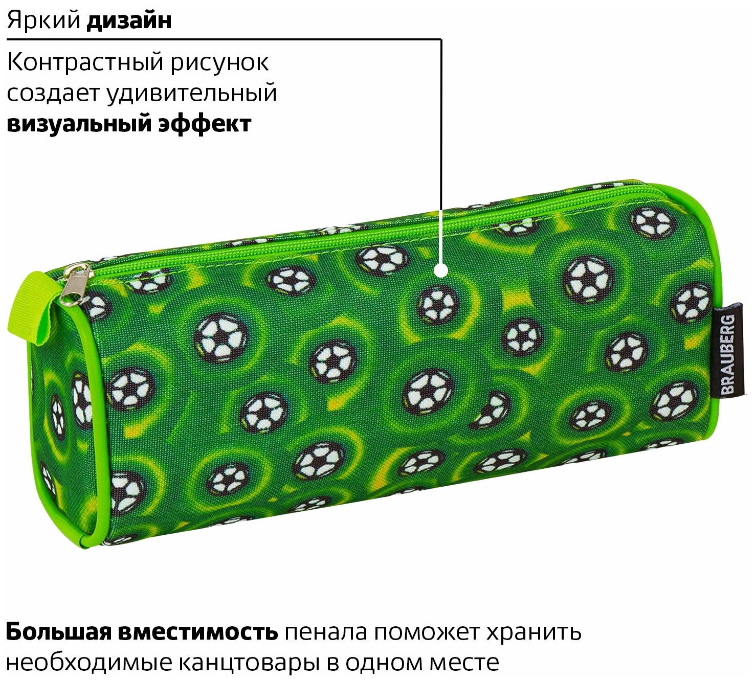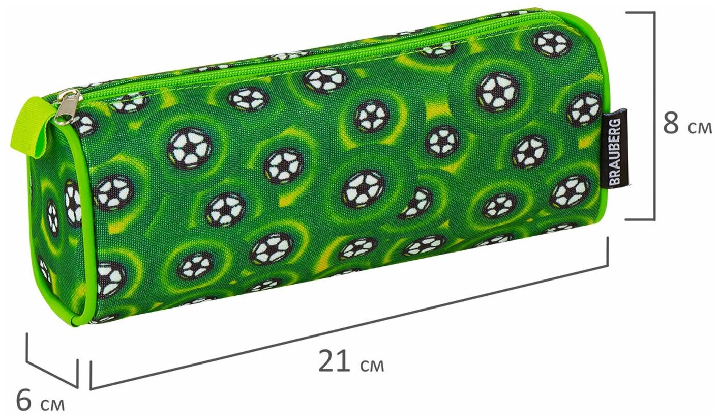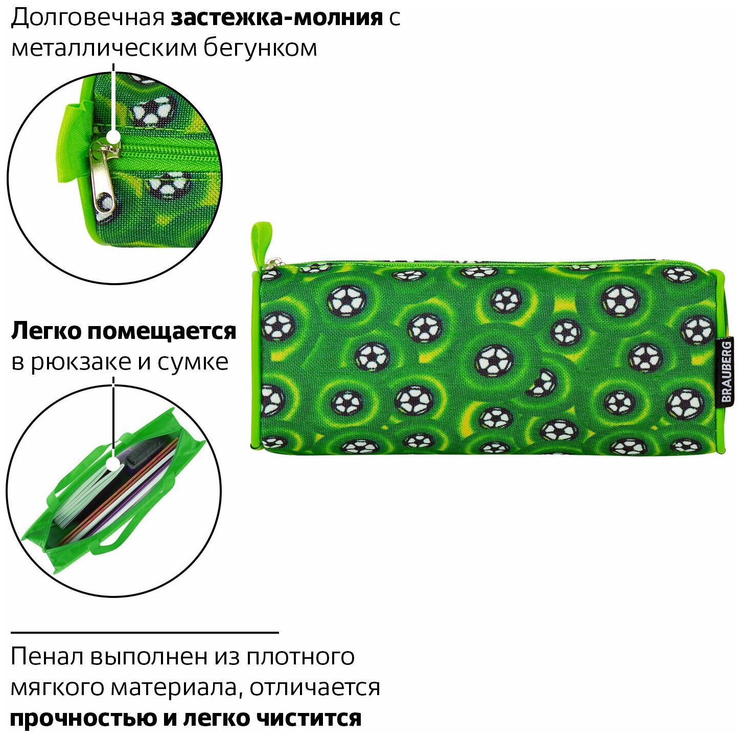 Пенал Brauberg «Футбольные мячи» выполнен из прочного мягкого материала с футбольным принтом. Пенал вмещает до 50 канцелярских принадлежностей стандартных размеров. Надежная молния оснащена удобным металлическим бегунком.
