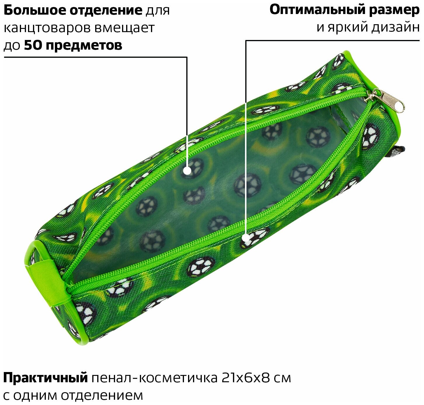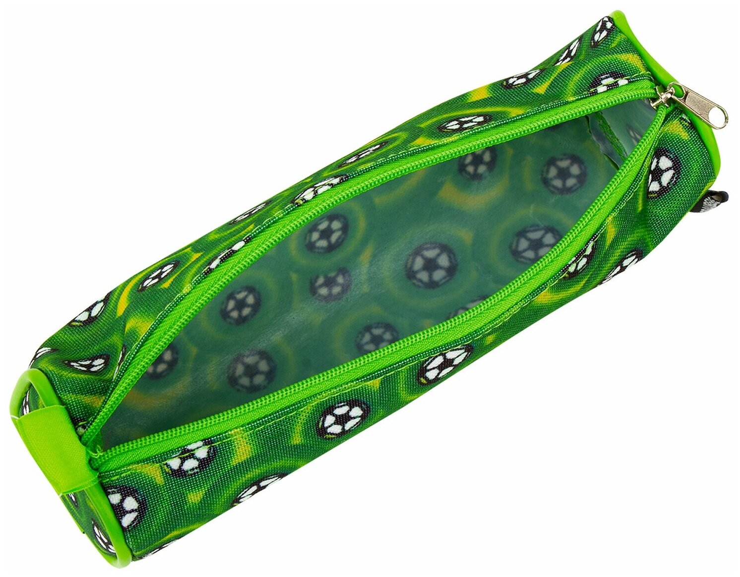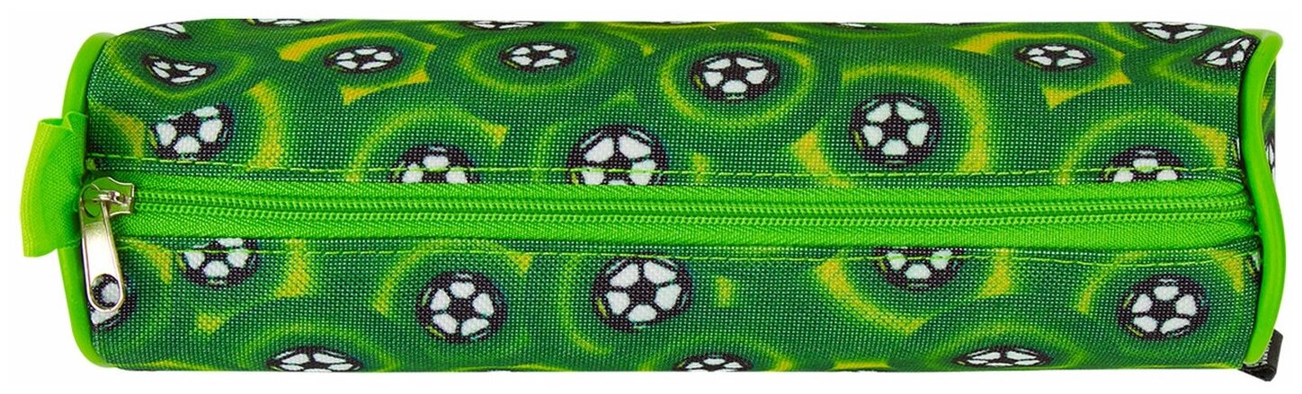 Изготовлен из полиэстера. Предназначен для учеников начальной школы. Пенал прямоугольной формы с одним вместительным отделением застегивается на молнию. Выполнен в зеленом цвете с футбольным принтом. Размер — 21х6х8 см.