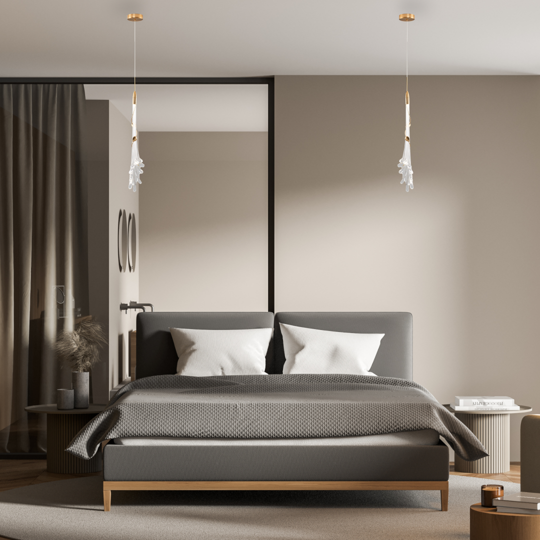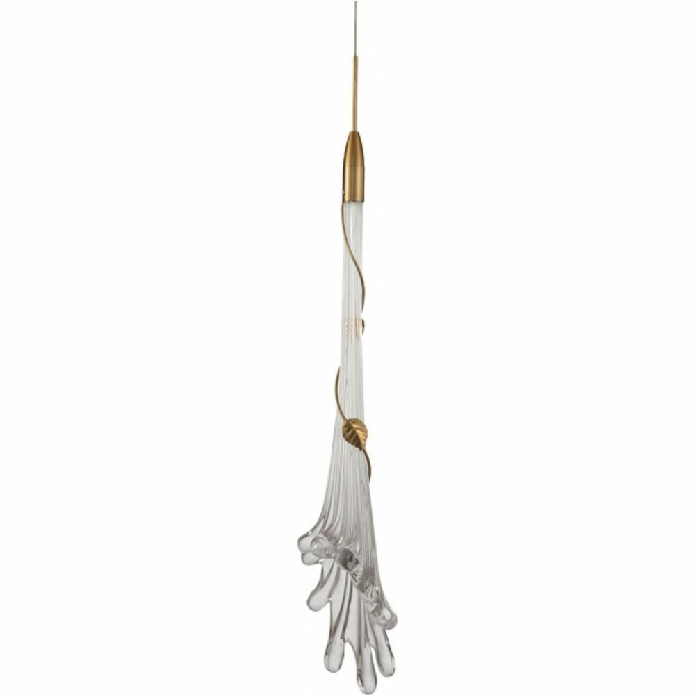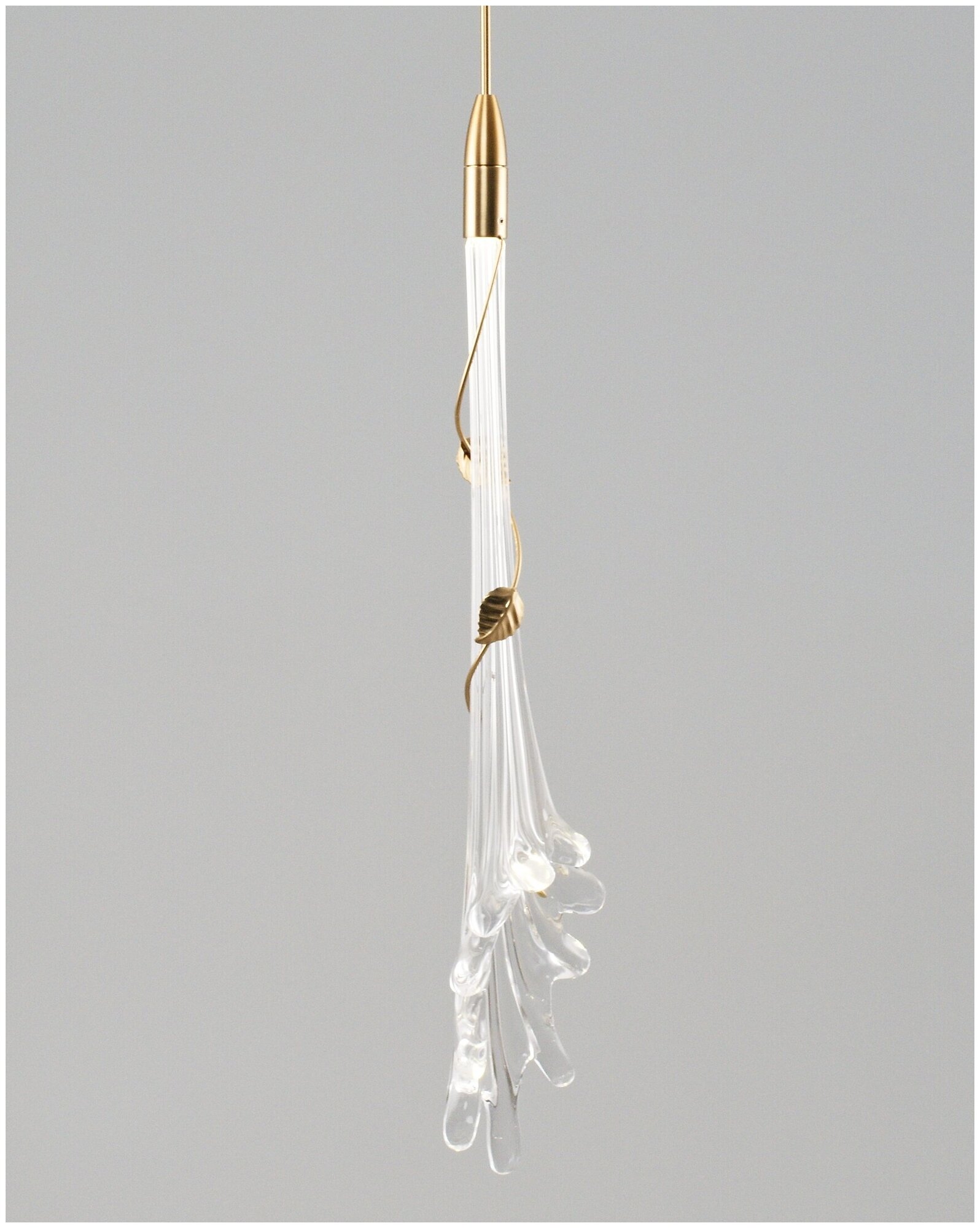Подвесной светильник из серии Melburn. Изящный стеклянный плафон в виде цветка украшен листьями лозы золотого цвета. В качестве источника света служат led лампы с общей мощностью 1 Вт и со световым потоком 120 Лм. Светильник прекрасно смотрится в комплекте из нескольких штук, так и в единичном экземпляре, подходит для точечного освещения и зонирования комнаты. Высоту светильника можно отрегулировать при монтаже с помощью подвесного троса.