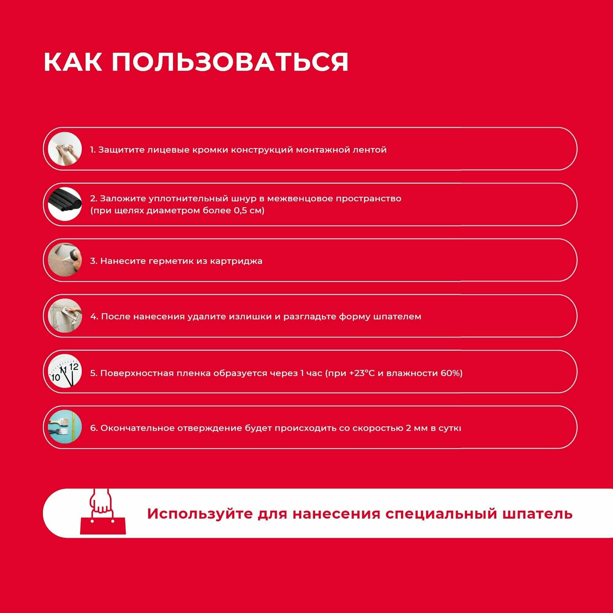 Предназначен для заделки и долговременной герметизации (тепло-водо-воздухозащиты): деформационных швов в строительных конструкциях; межбревенных и межвенцовых стыков сруба (внутри и снаружи помещений); трещин в бревнах; торцевого спила бревен; обходов окон и дверей; примыканий деревянных конструкций к фундаменту и кровельным элементам, а также стыков между брусом, деревянными панелями и т. п. в конструкциях домов. Свойства: имеет высокую адгезию к дереву, кирпичу, штукатурке, натуральному камню, бетону, полимербетону, пенобетону; обладает высокой эластичностью; устойчив к УФ-излучению; устойчив к образованию плесени; надежно защищает стыки и швы от проникновения влаги и холода, хорошо сохраняет тепло; состав можно наносить на поверхности с отрицательными и положительными углами наклона благодаря высокой тиксотропности.
