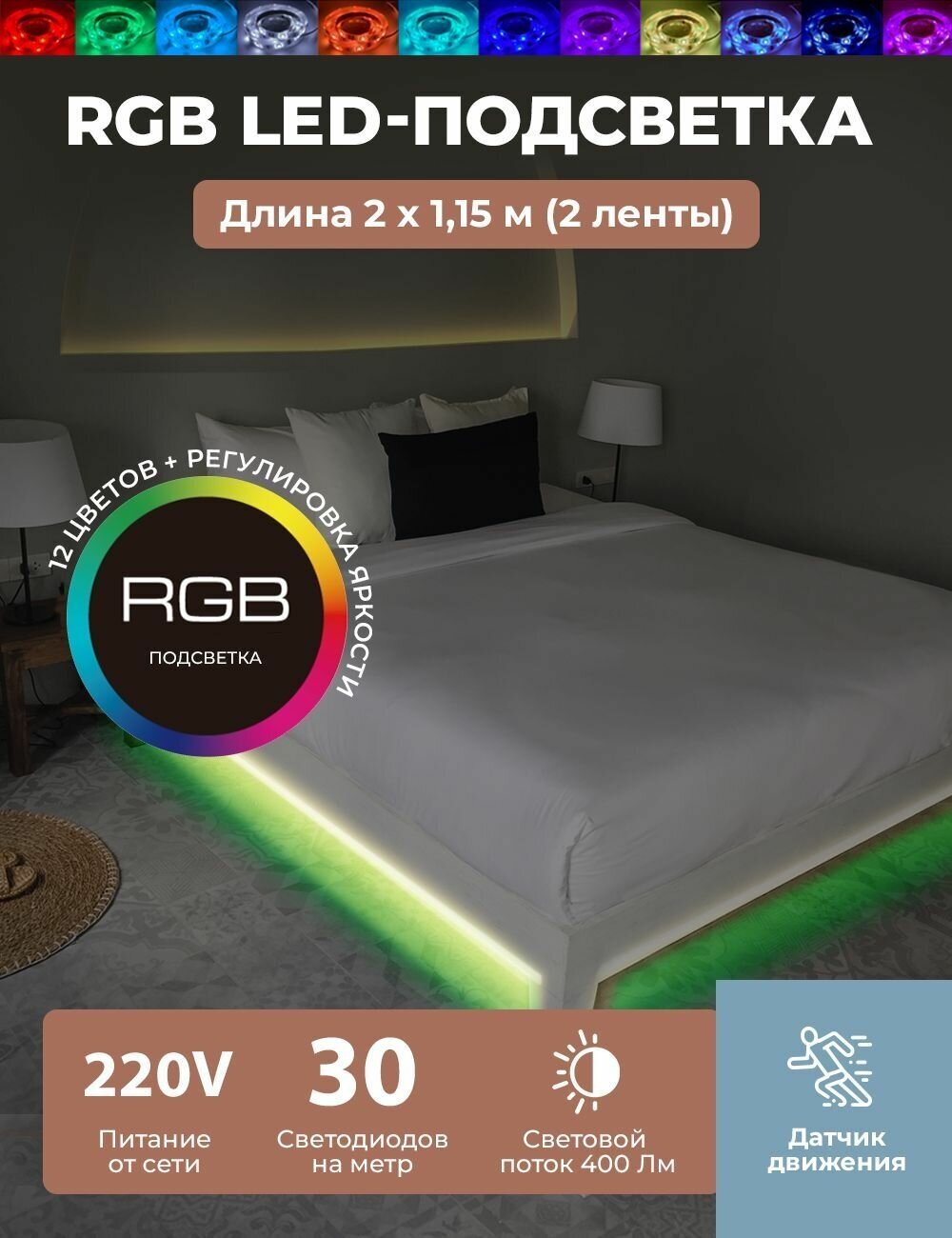 Светодиодная лента для подсветки двуспальной кровати 2x1.5 м цветная Гелеос (LED-BL8-DoubleRGB)