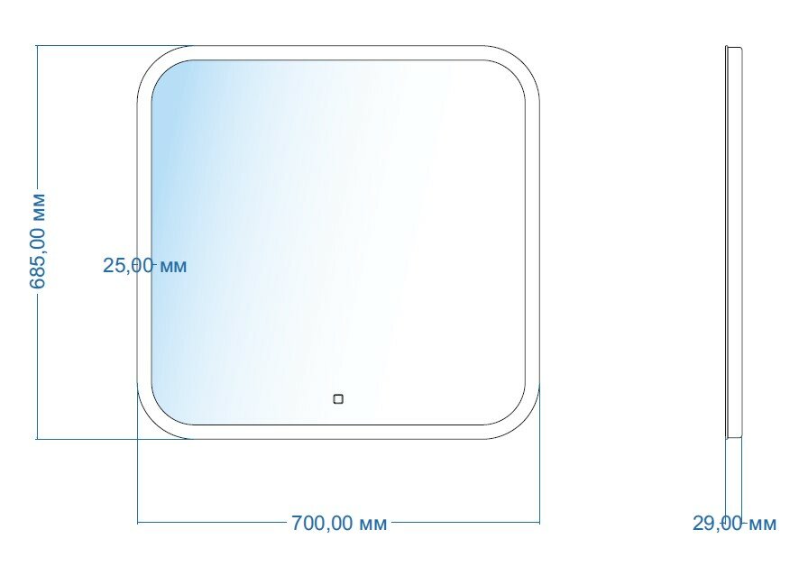 | Дополнительная информация | Зеркало оснащено сенсорным выключателем с функцией плавного диммирования с запоминанием последнего значения. Короткое касание светящейся области включает/выключает подсветку, длительное касание меняет яркость свечения. |