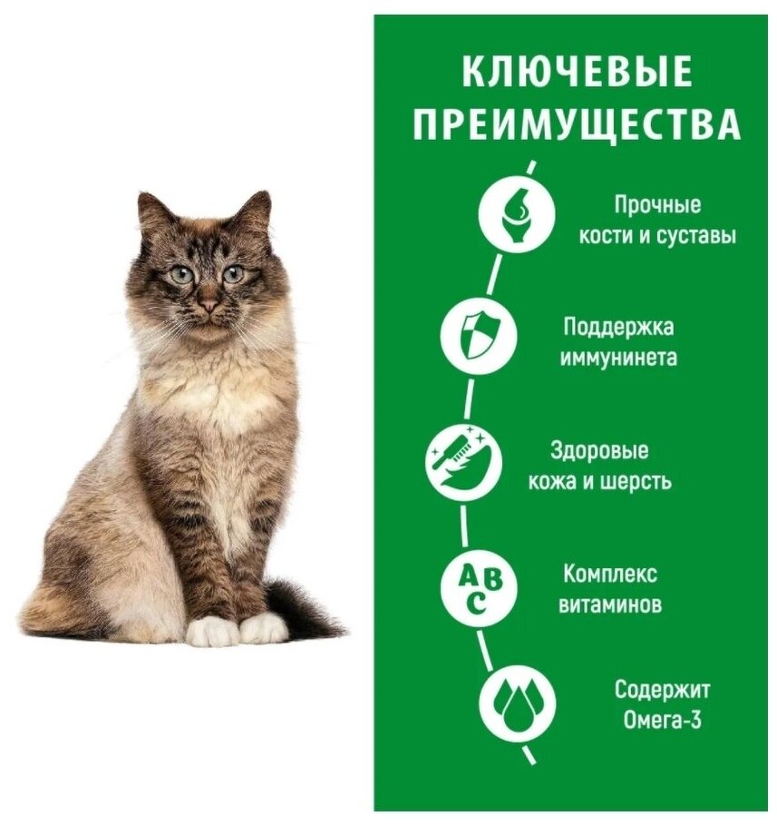 - В состав корма входят только тщательно отобранные ингредиенты, которые способствуют нормализации работы пищеварительной системы кошки.