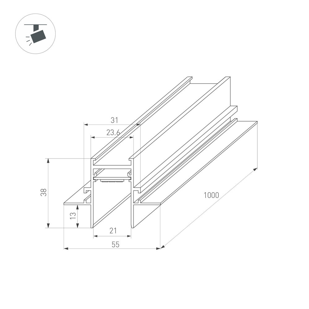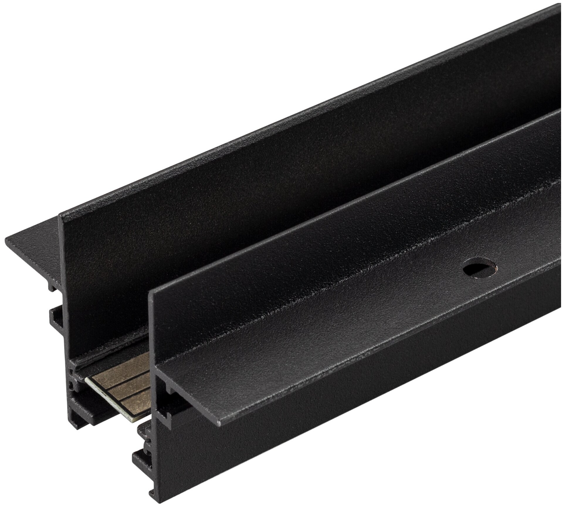 Встраиваемый магнитный трек с фланцем для монтажа в гипсокартонный потолок, длина 1000 мм. DC24V. Материал алюминий, цвет черный. Две заглушки в комплекте. Размер ДxШxВ: 1000x55x38 мм. Размер (с учетом заглушек и фланцев) ДxШxВ: 1003x55x38 мм. DC24V.