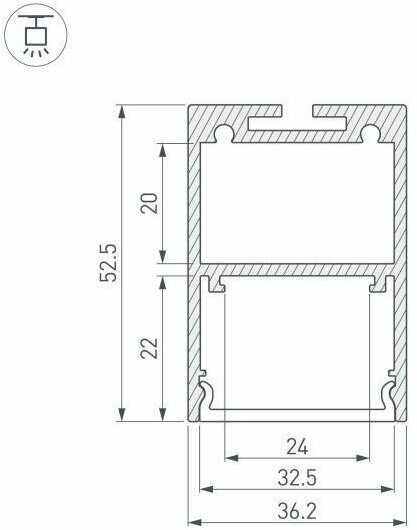 Подвесной профиль из анодированного алюминия с отсеком для блока питания (32х20 мм) для контурной подсветки помещений. Габаритные размеры профиля составляют 3000 мм в длину, 36,2 мм в ширину и 52,5 мм в высоту. Площадка для установки светодиодных лент позволяет использовать ленту шириной до 24 мм и мощностью до 46,5 Вт/м. Это обеспечивает гибкость в выборе светодиодных лент и создает потрясающие световые решения. Отличное решение для создания современных световых проектов.