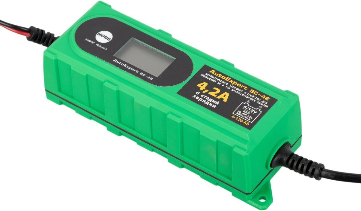 Зарядное устройство AutoExpert BC-42 предназначено для всех аккумуляторов свинцово-кислотного типа. Оно полностью автоматизировано и поэтому не доставит Вам никаких лишних хлопот, так как не требует особого вмешательства. Как только батарея окажется заряженной до конца, на экране загорится знак, оповещающий об этом. Функция автоматического выключения нейтрализует опасность перезарядки. AutoExpert BC-42 рекомендовано для эксплуатации в помещении. Допустимы короткие по времени периоды использования на открытом воздухе, в том случае, если нет дождя, снега или тумана. Заряд возможен в четырех режимах. На то, какой именно выбрать, влияет напряжение и емкость батареи.
