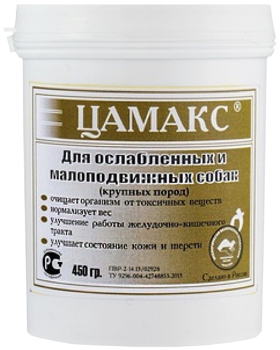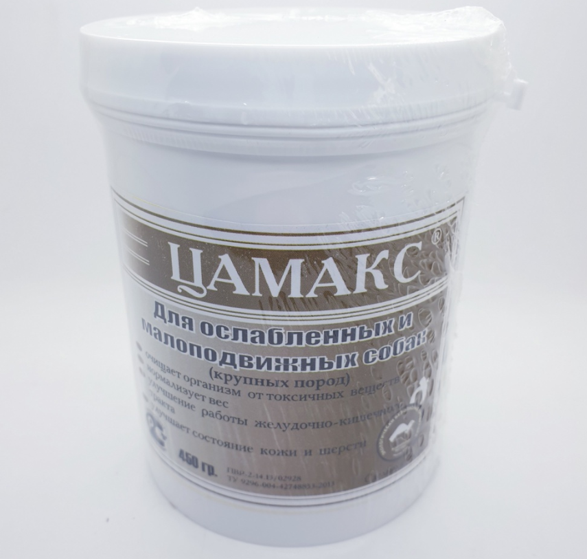 Цамакс для ослабленных и малоподвижных животных восстанавливает обмен веществ, улучшает работу желудочно-кишечного тракта, повышает сопротивляемость организма к различным заболеваниям, в том числе к инфекционным, выводит из организма токсичные вещества при отравлениях, увеличивает активность и подвижность животных. Нормализует вес. Показания к применению: препарат является сильным средством для восстановления животных после перенеснных больших физических нагрузок, экстремальных ситуаций и травм, а также для: Улучшения работы желудочно-кишечного тракта; Повышения естественной ризистентности организма к различным заболеваниям; Выведения токсичных веществ при различного рода пищевых отравлениях ; Оздоровительной профилактики стареющих и ослабленных животных; Востановлению функции щитовидной железы; Развитию, восстановления костной ткани; Восстановления после операционных вмешательств и ранений; Регулирования сердечно-сосудистой системы. Препарат содержит: цеолит, серу, белки, витамины, углеводы, липиды, пигменты, йод, Ca, K, Fe, Na, P, Si, S, Se, Mg и другие. Способ применения и нормы расхода: препарат применяют в качестве добавки к основному рациону собак, смешивают с кормом непосредственно перед кормлением в дозе 03-0,5 г на 1 кг . веса животного, что соответствует: для собак малых пород 1 чайная ложка ( 7 грамм добавки) в день, средних пород 2-3 чайные ложки в день, крупных пород 1-2 столовые ложки в день. Дают один раз в течение 3-4 недель. Кормовая добавка не токсична, побочных явлений и осложнений не вызывает.