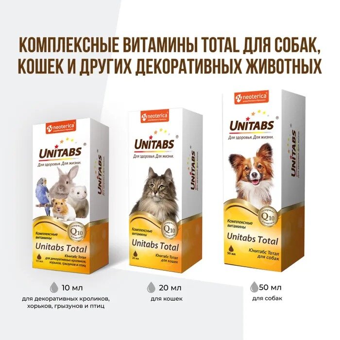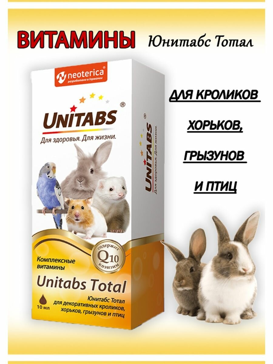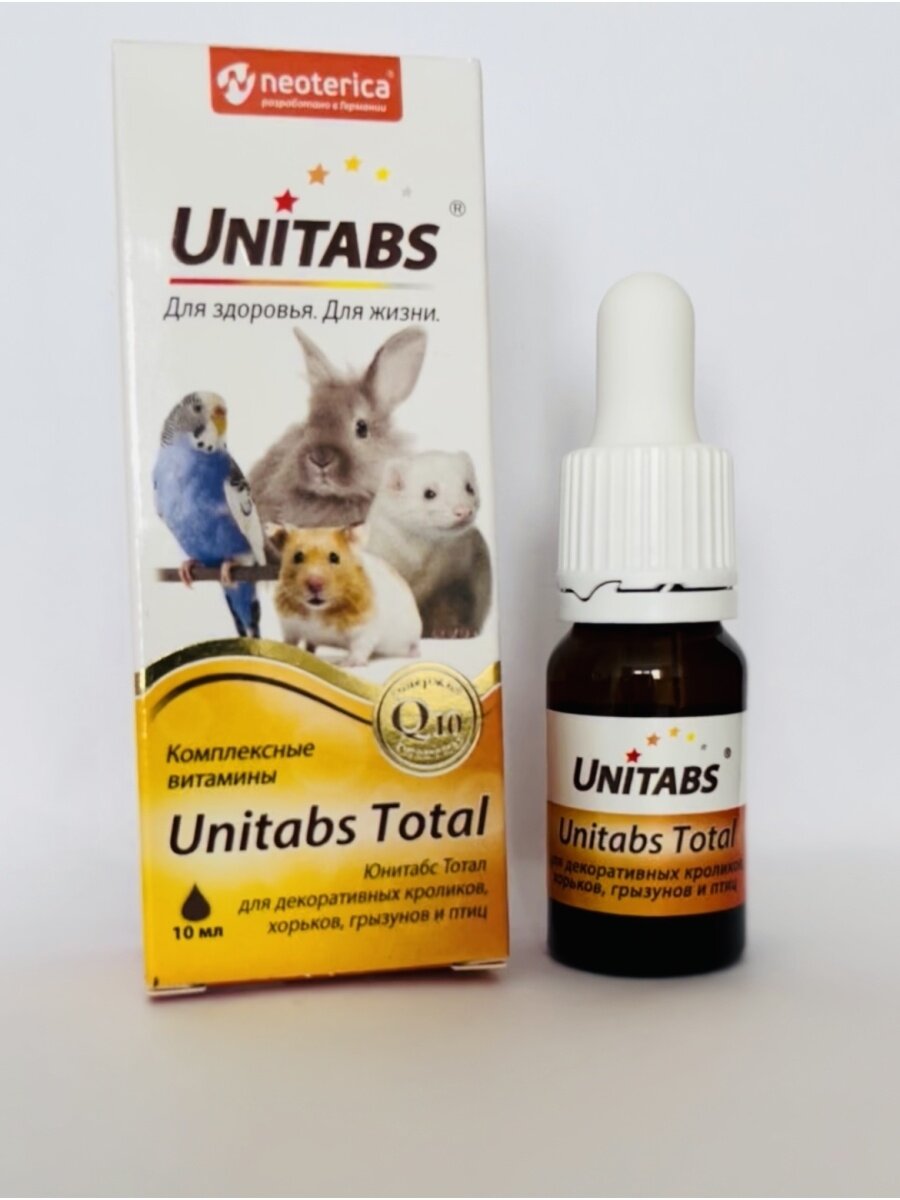 Unitabs Total — это витаминный комплекс для птиц и грызунов, который содержит коэнзим Q10 и все необходимые витамины для улучшения состояния кожи, шерсти, оперения и иммунитета питомца.