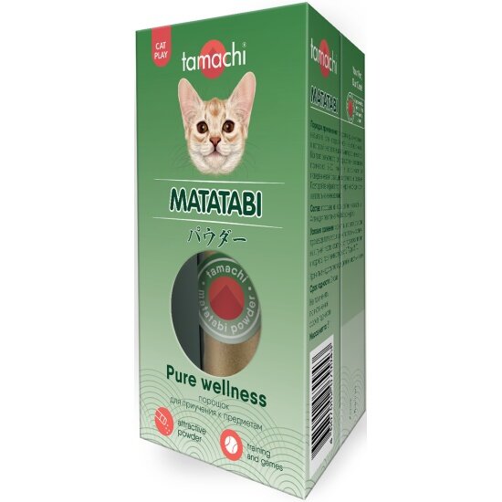 Порошок Мататаби — универсальное средство для продолжительных игр и поднятия настроения кошки. Не вызывает перевозбуждения нервной системы и повышенной агрессивности. Подходит для приучения к когтеточкам, лежанкам и переноскам. Снимает стресс, повышает психоэмоциональный и физический тонус питомца. Так же способствует решению проблемы ожирения кошек, стимулируя их к активным играм. Откройте крышку флакона, насыпьте его содержимое на поверхность, к которой желаете вызвать интерес животного. Контакт животного со средством составляет примерно 5- 30 минут в зависимости от поведенческой реакции животного на растение. Повторяйте обработку по мере необходимости, желательно еженедельно.