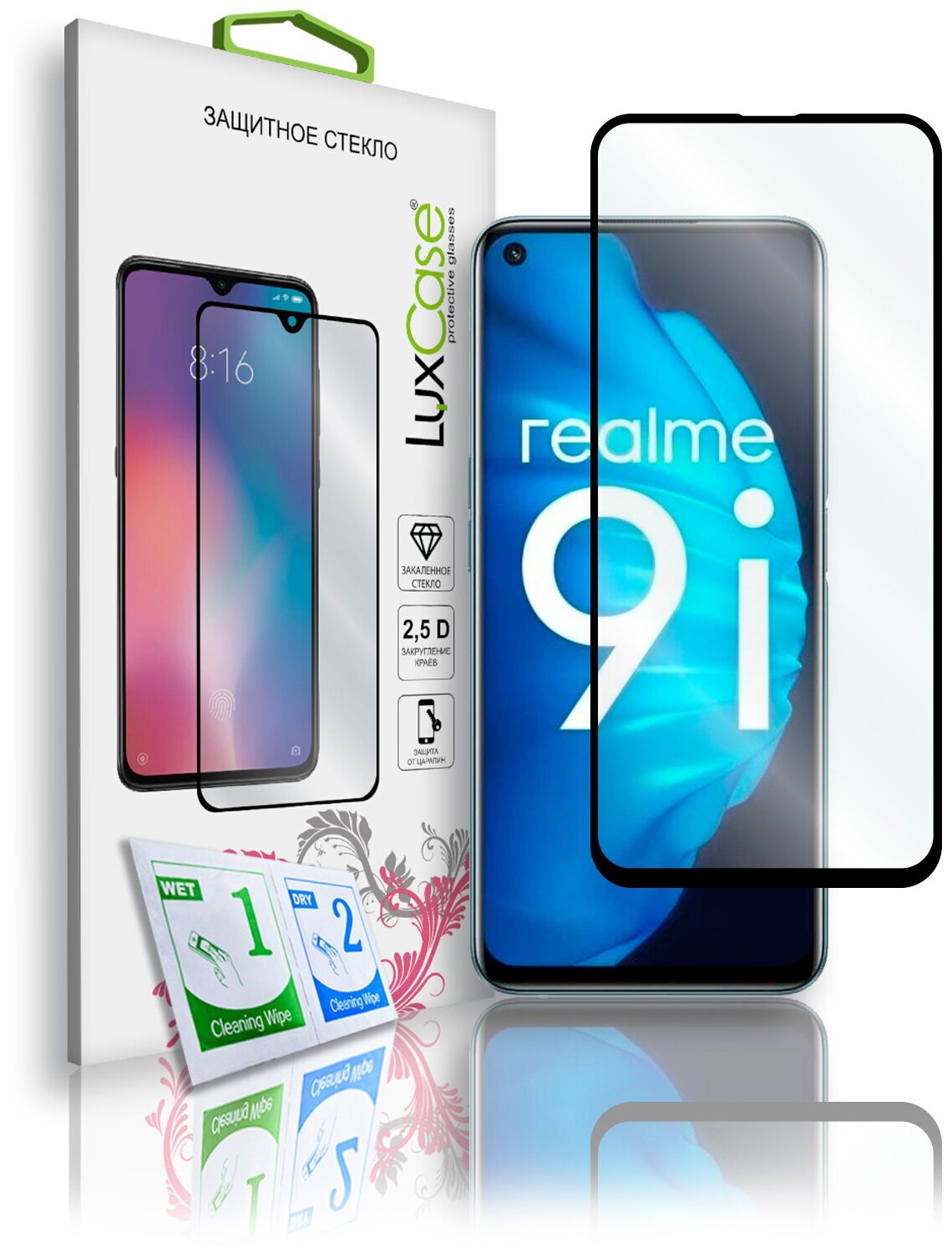 Защитное стекло LuxCase для Realme 9i, 2.5D, Полноклеевое, Черная рамка. Внимание! Стекло 2.5D может покрывать только часть скругленных краев экрана, что позволяет повысить их износостойкость и хорошо сочетаться с защитным чехлом. Клеевой слой - по всей поверхности стекла - позволяет использовать данный вид стекла на экранах со скруглениями без засветов и уменьшить ширину крашеной рамки. Пластиковая подложка предохраняет клеевой слой от повреждения. А олеофобное покрытие предотвращает появления отпечатков пальцев, следов и разводов. В комплект входят влажная и сухая салфетки и наклейка-пылеудалитель. Рекомендуем проверять стекла при получении.