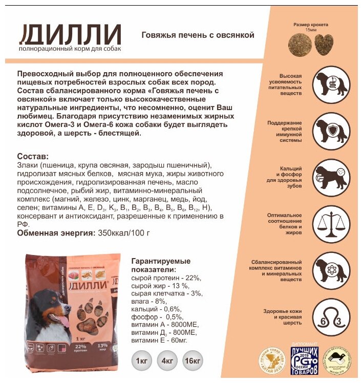 Сухой корм Дилли с говяжьей печенью и овсянкой для взрослых собак средних и крупных пород - оптимальный выбор для полноценного питания любимца. В составе рациона содержатся все необходимые для питомца витамины и микроэлементы.