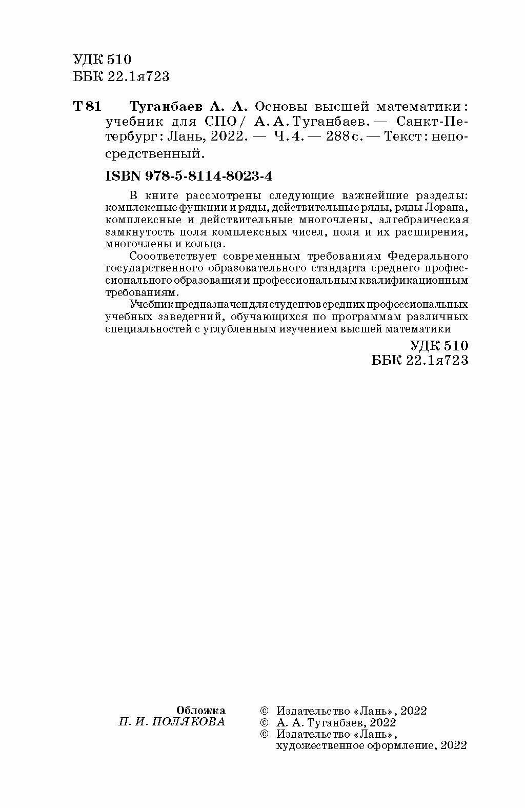 Основы высшей математики Часть 4 Учебник (А. А. Туганбаев); Издательство ЛАНЬ, 2022