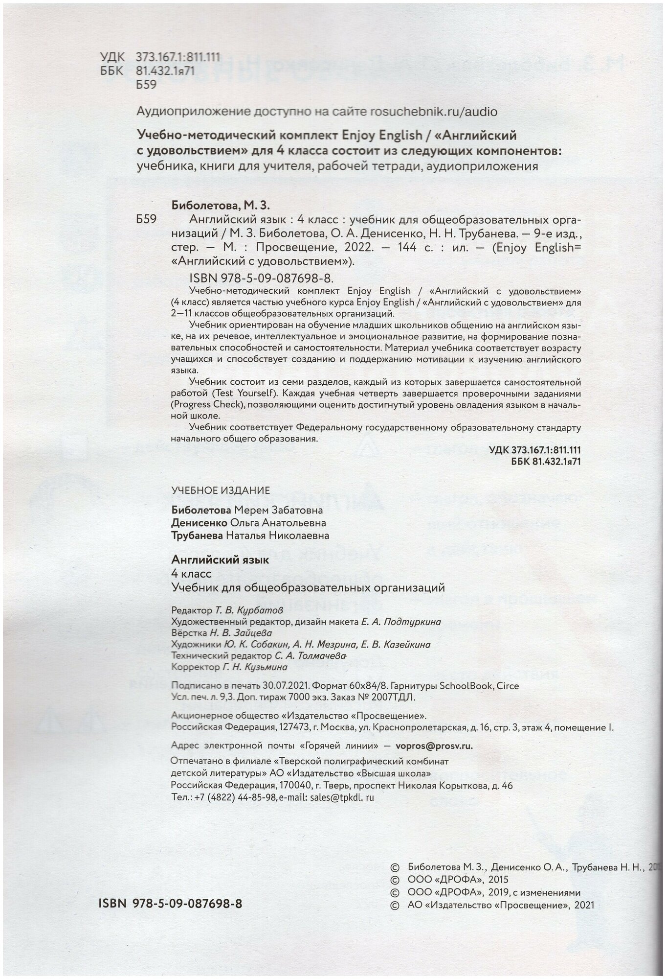 Enjoy English Английский с удовольствием Английский язык Учебник для 4 класса общеобразовательных учреждений (Биболетова Мерем Забатовна, Денисенко Ольга Анатольевна, Трубанева Наталия Николаевна); Просвещение, 2022