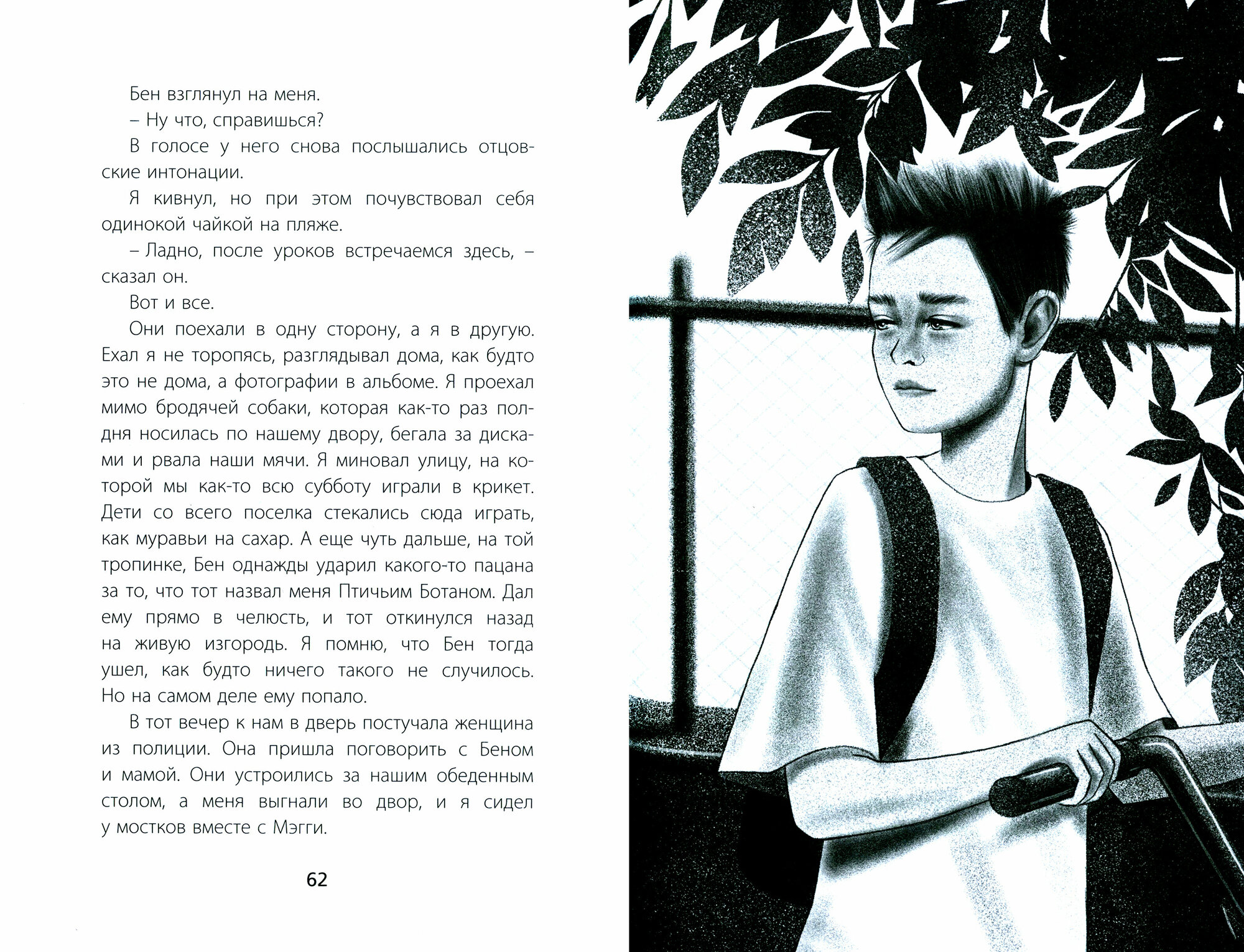 Автор и переводчик так здорово описали мальчишек, что кажется, будто они живут на соседней улице, а не на другом конце света. Я вспоминала об Австралии только когда читала имена героев или местные название. Повесть пронизана душевной теплотой и внутренним светом. Здесь нет сильной динамики, но не хочется отрываться от чтения. Хочется с этими героями жить. По эмоциональной составляющей я бы поставила этого автора рядом с любимой Ниной Дашевской. Вот только музыку здесь заменили птицы. -